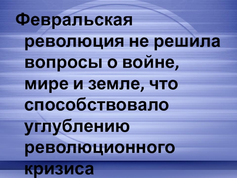 Слайд 17Февральская революция не решила вопросы о войне, мире и земле, что