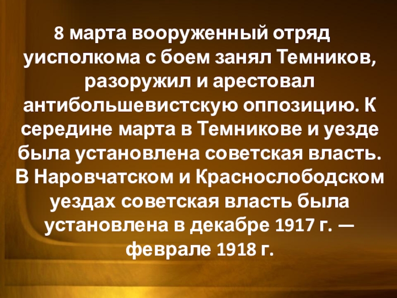арестовал антибольшевистскую оппозицию. К середине марта в Темникове и уезде была установлена советская власть. В Наровчатском и Краснослободском уездах советская власть была установлена в декабре 1917 г. — феврале 1918 г.