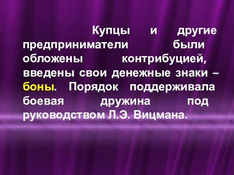 денежные знаки – боны. Порядок поддерживала боевая дружина под руководством Л.Э. Вицмана.