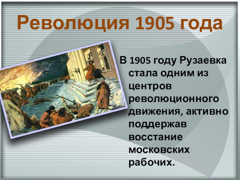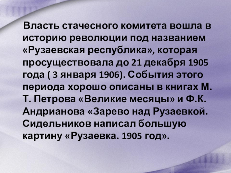 «Рузаевская республика», которая просуществовала до 21 декабря 1905 года ( 3 января 1906). События этого периода хорошо описаны в книгах М.Т. Петрова «Великие месяцы» и Ф.К. Андрианова «Зарево над Рузаевкой. Сидельников написал большую картину «Рузаевка. 1905 год».