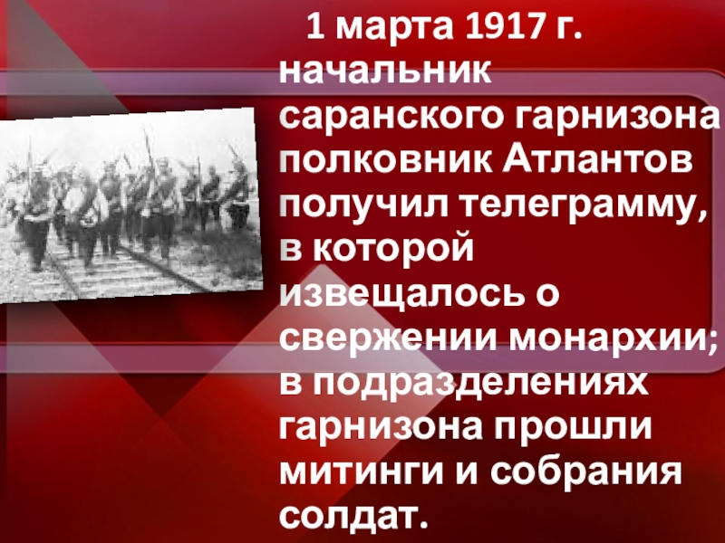 Слайд 91 марта 1917 г. начальник саранского гарнизона полковник Атлантов получил телеграмму,