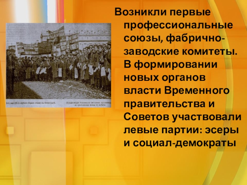 Слайд 15Возникли первые профессиональные союзы, фабрично-заводские комитеты. В формировании новых органов власти