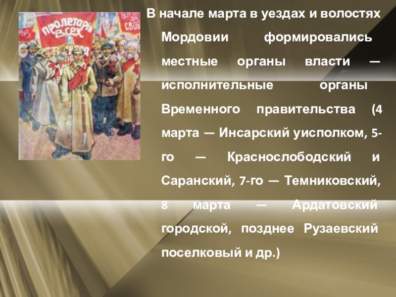Слайд 12В начале марта в уездах и волостях Мордовии формировались местные органы