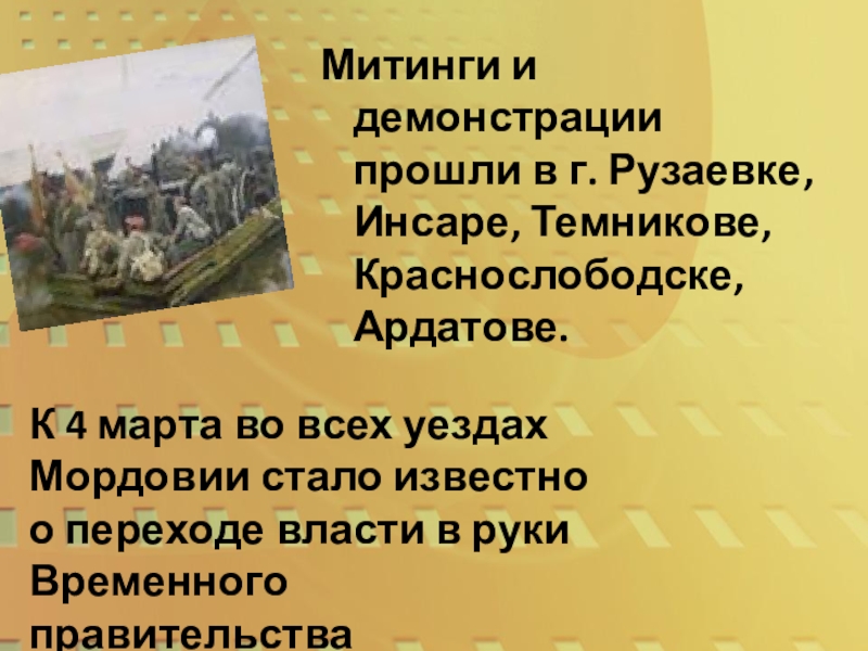 Слайд 11Митинги и демонстрации прошли в г. Рузаевке, Инсаре, Темникове, Краснослободске, Ардатове.