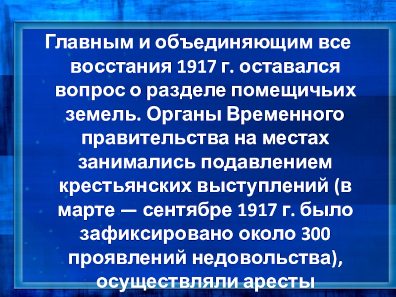 Слайд 16Главным и объединяющим все восстания 1917 г. оставался вопрос о разделе