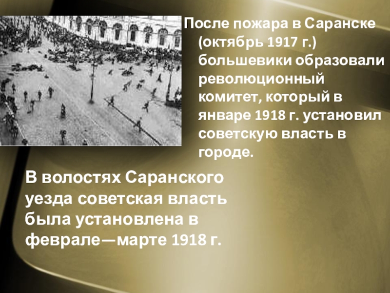 Слайд 21После пожара в Саранске (октябрь 1917 г.) большевики образовали революционный комитет,