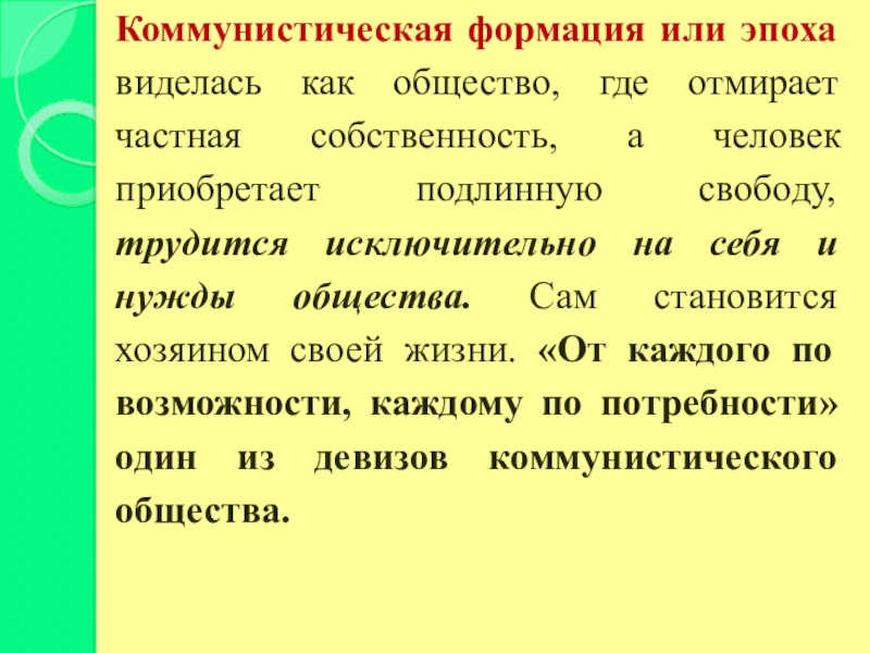 Слайд 14Коммунистическая формация или эпоха виделась как общество, где отмирает частная