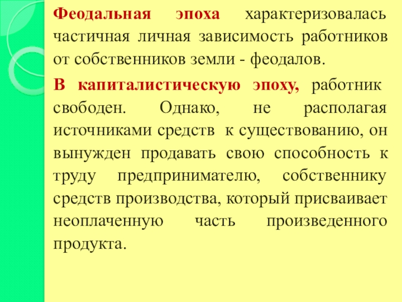 Слайд 13Феодальная эпоха характеризовалась частичная личная зависимость работников от собственников земли -