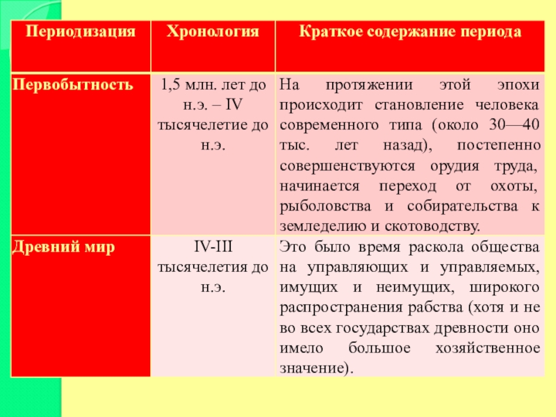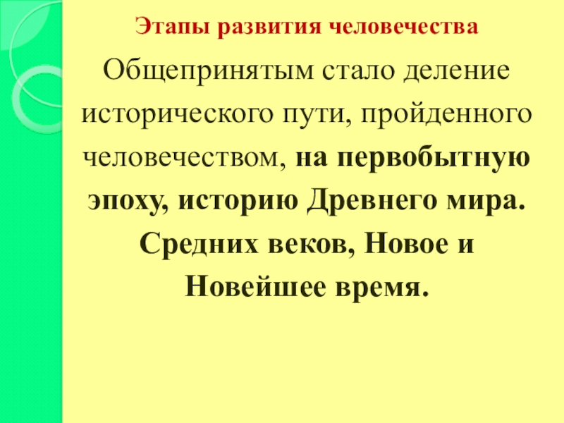 Общепринятым стало деление исторического пути, пройденного человечеством, на первобытную