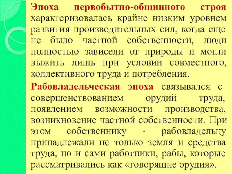 Рабовладельческая эпоха связывался с совершенствованием орудий труда, появлением возможности производства, возникновение частной собственности. При этом собственнику - рабовладельцу принадлежали не только земля и средства труда, но и сами работники, рабы, которые рассматривались как «говорящие орудия».