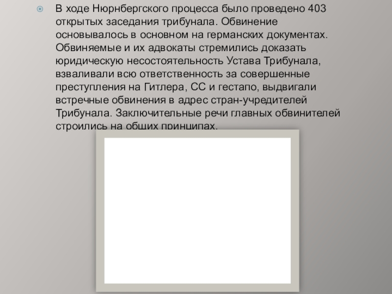 Слайд 17В ходе Нюрнбергского процесса было проведено 403 открытых заседания трибунала. Обвинение
