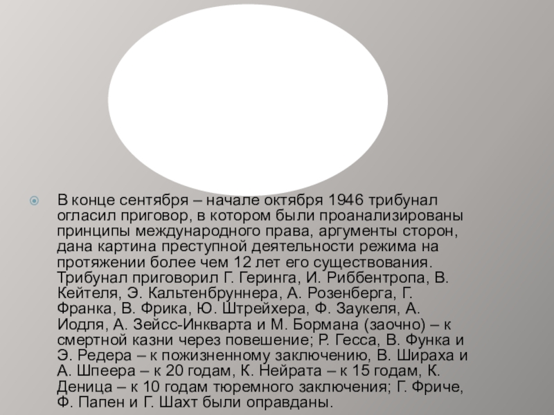 котором были проанализированы принципы международного права, аргументы сторон, дана картина преступной деятельности режима на протяжении более чем 12 лет его существования. Трибунал приговорил Г. Геринга, И. Риббентропа, В. Кейтеля, Э. Кальтенбруннера, А. Розенберга, Г. Франка, В. Фрика, Ю. Штрейхера, Ф. Заукеля, А. Иодля, А. Зейсс-Инкварта и М. Бормана (заочно) – к смертной казни через повешение; Р. Гесса, В. Функа и Э. Редера – к пожизненному заключению, В. Шираха и А. Шпеера – к 20 годам, К. Нейрата – к 15 годам, К. Деница – к 10 годам тюремного заключения; Г. Фриче, Ф. Папен и Г. Шахт были оправданы.