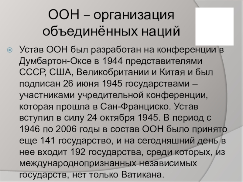 Думбартон-Оксе в 1944 представителями СССР, США, Великобритании и Китая и был подписан 26 июня 1945 государствами – участниками учредительной конференции, которая прошла в Сан-Франциско. Устав вступил в силу 24 октября 1945. В период с 1946 по 2006 годы в состав ООН было принято еще 141 государство, и на сегодняшний день в нее входит 192 государства, среди которых, из международнопризнанных независимых государств, нет только Ватикана.