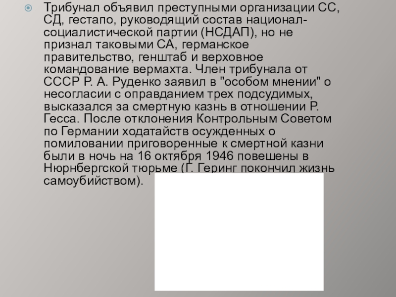 (НСДАП), но не признал таковыми СА, германское правительство, генштаб и верховное командование вермахта. Член трибунала от СССР Р. А. Руденко заявил в "особом мнении" о несогласии с оправданием трех подсудимых, высказался за смертную казнь в отношении Р. Гесса. После отклонения Контрольным Советом по Германии ходатайств осужденных о помиловании приговоренные к смертной казни были в ночь на 16 октября 1946 повешены в Нюрнбергской тюрьме (Г. Геринг покончил жизнь самоубийством).