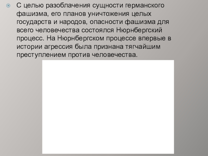и народов, опасности фашизма для всего человечества состоялся Нюрнбергский процесс. На Нюрнбергском процессе впервые в истории агрессия была признана тягчайшим преступлением против человечества.