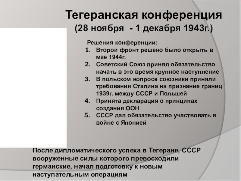 После дипломатического успеха в Тегеране, СССР вооруженные силы которого превосходили германские, начал подготовку к новым наступательным операциям