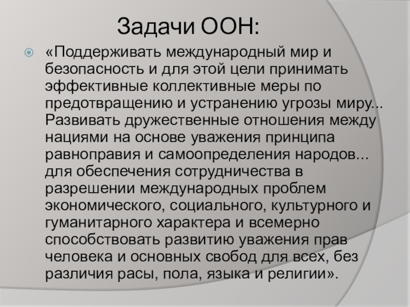 эффективные коллективные меры по предотвращению и устранению угрозы миру... Развивать дружественные отношения между нациями на основе уважения принципа равноправия и самоопределения народов... для обеспечения сотрудничества в разрешении международных проблем экономического, социального, культурного и гуманитарного характера и всемерно способствовать развитию уважения прав человека и основных свобод для всех, без различия расы, пола, языка и религии».