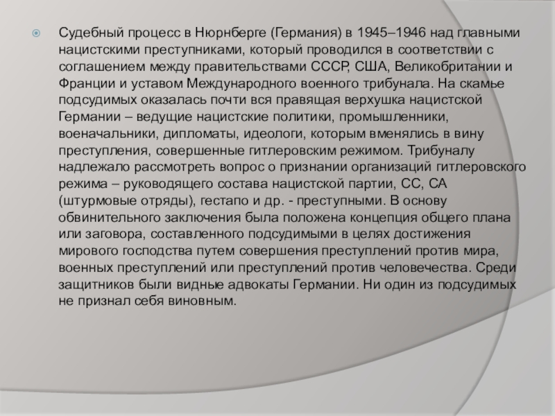 который проводился в соответствии с соглашением между правительствами СССР, США, Великобритании и Франции и уставом Международного военного трибунала. На скамье подсудимых оказалась почти вся правящая верхушка нацистской Германии – ведущие нацистские политики, промышленники, военачальники, дипломаты, идеологи, которым вменялись в вину преступления, совершенные гитлеровским режимом. Трибуналу надлежало рассмотреть вопрос о признании организаций гитлеровского режима – руководящего состава нацистской партии, СС, СА (штурмовые отряды), гестапо и др. - преступными. В основу обвинительного заключения была положена концепция общего плана или заговора, составленного подсудимыми в целях достижения мирового господства путем совершения преступлений против мира, военных преступлений или преступлений против человечества. Среди защитников были видные адвокаты Германии. Ни один из подсудимых не признал себя виновным.
