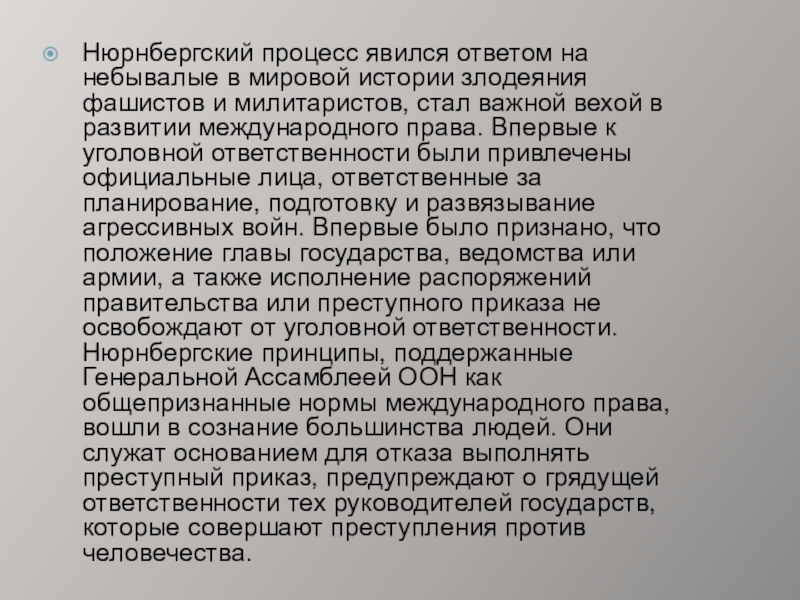 и милитаристов, стал важной вехой в развитии международного права. Впервые к уголовной ответственности были привлечены официальные лица, ответственные за планирование, подготовку и развязывание агрессивных войн. Впервые было признано, что положение главы государства, ведомства или армии, а также исполнение распоряжений правительства или преступного приказа не освобождают от уголовной ответственности. Нюрнбергские принципы, поддержанные Генеральной Ассамблеей ООН как общепризнанные нормы международного права, вошли в сознание большинства людей. Они служат основанием для отказа выполнять преступный приказ, предупреждают о грядущей ответственности тех руководителей государств, которые совершают преступления против человечества.