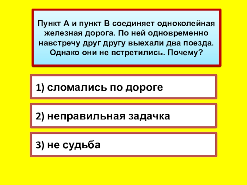 Пункт А и пункт В соединяет одноколейная железная дорога. По ней одновременно навстречу друг другу выехали два поезда. Однако они не встретились. Почему?