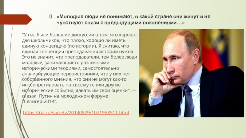 "У нас были большие дискуссии о том, что хорошо для школьников, что плохо, хорошо ли иметь единую концепцию (по истории). Я считаю, что единая концепция преподавания истории нужна. Это не значит, что преподаватели, тем более люди молодые, занимающиеся различными историческими теориями, самостоятельно анализирующие первоисточники, что у них нет собственного мнения, что они не могут как-то интерпретировать по-своему те или другие исторические события, давать им свои оценки", — сказал Путин на молодежном форуме "Селигер-2014".