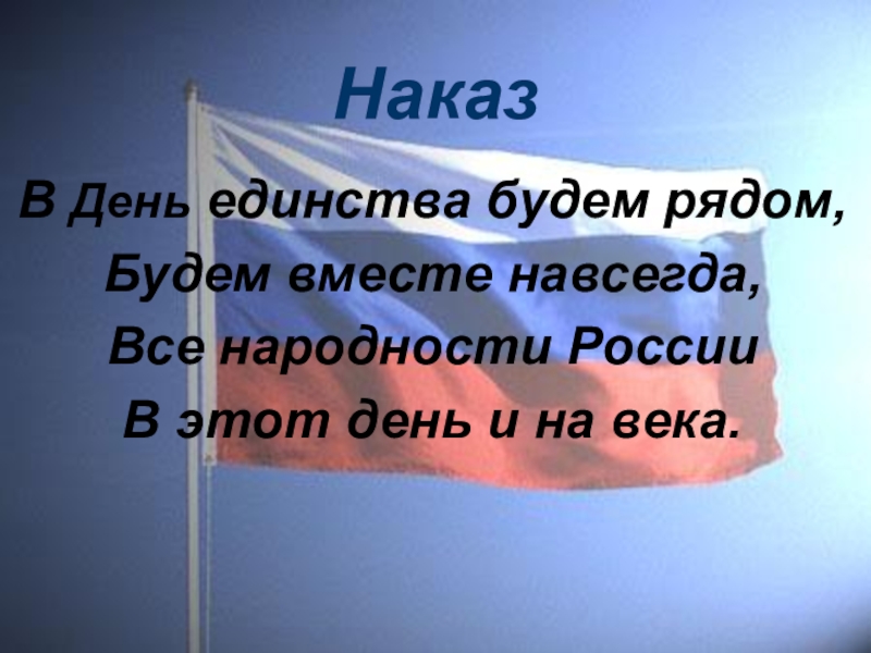 НаказВ День единства будем рядом,Будем вместе навсегда,Все народности РоссииВ этот день и на века.