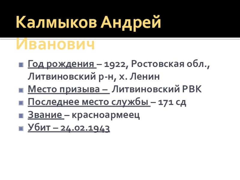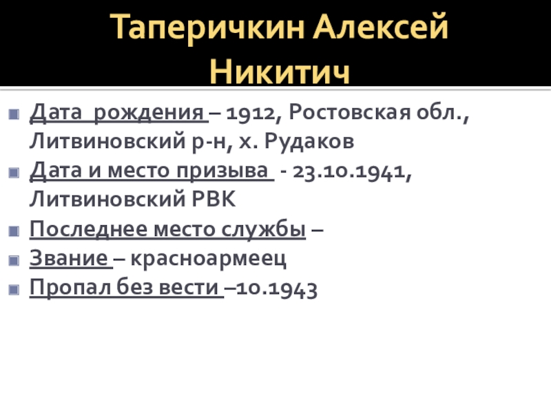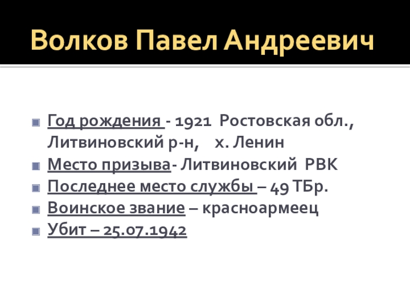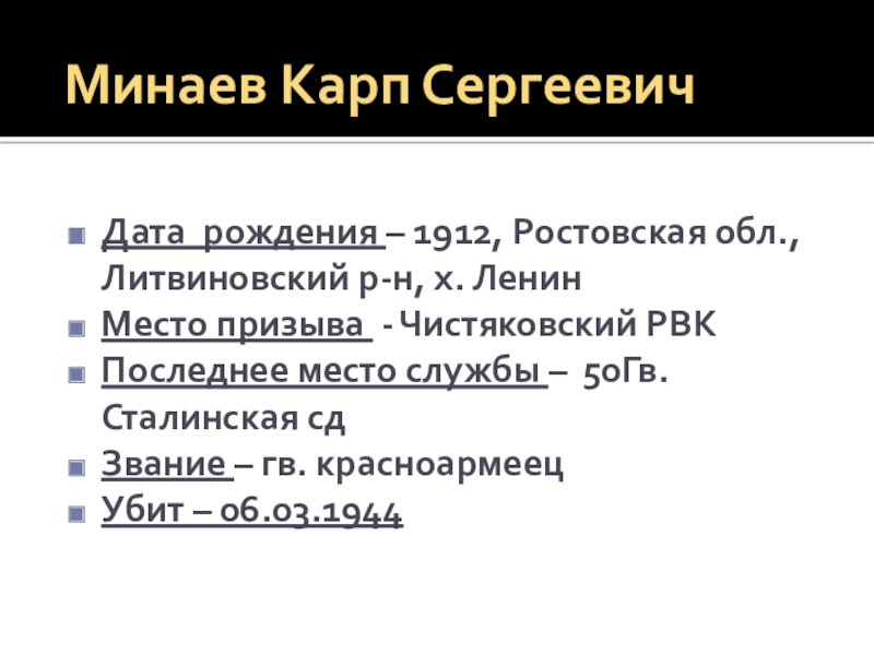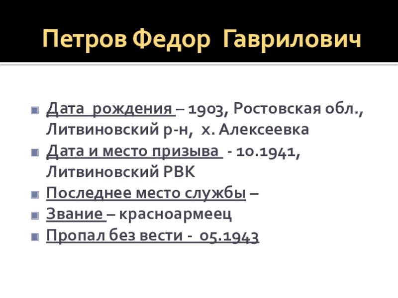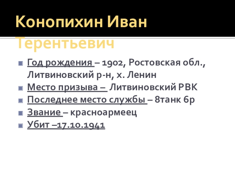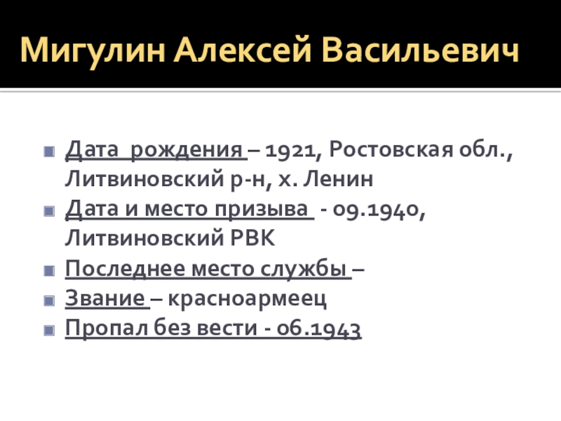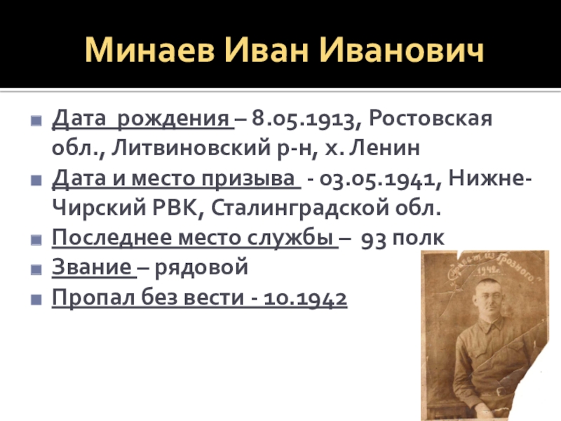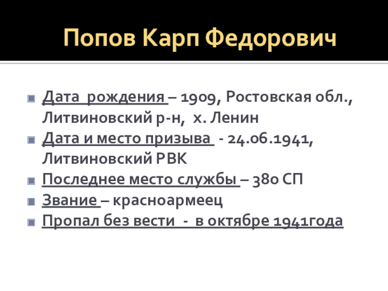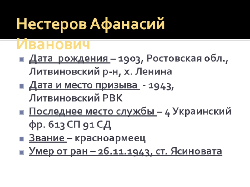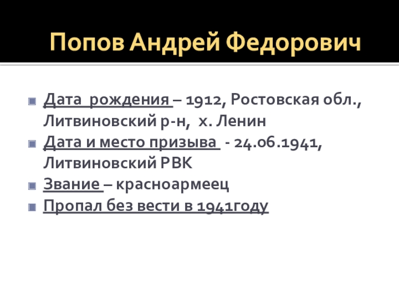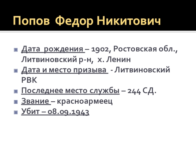 Дата рождения – 1905Ростовская обл., Литвиновский р-н, х. Ленин