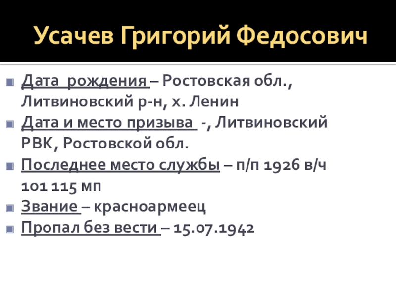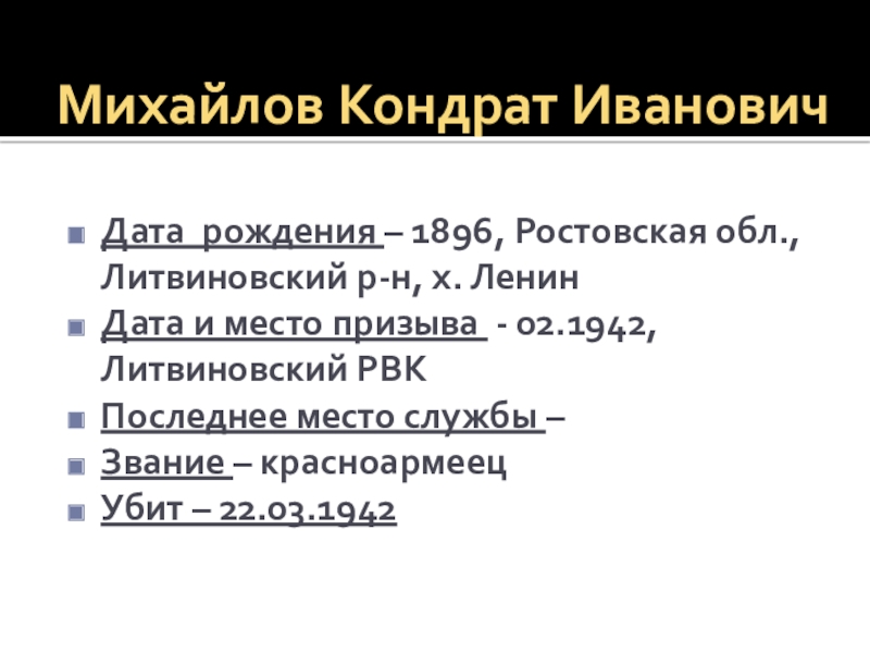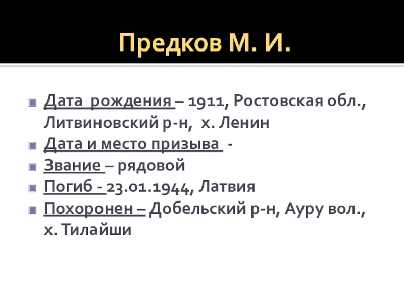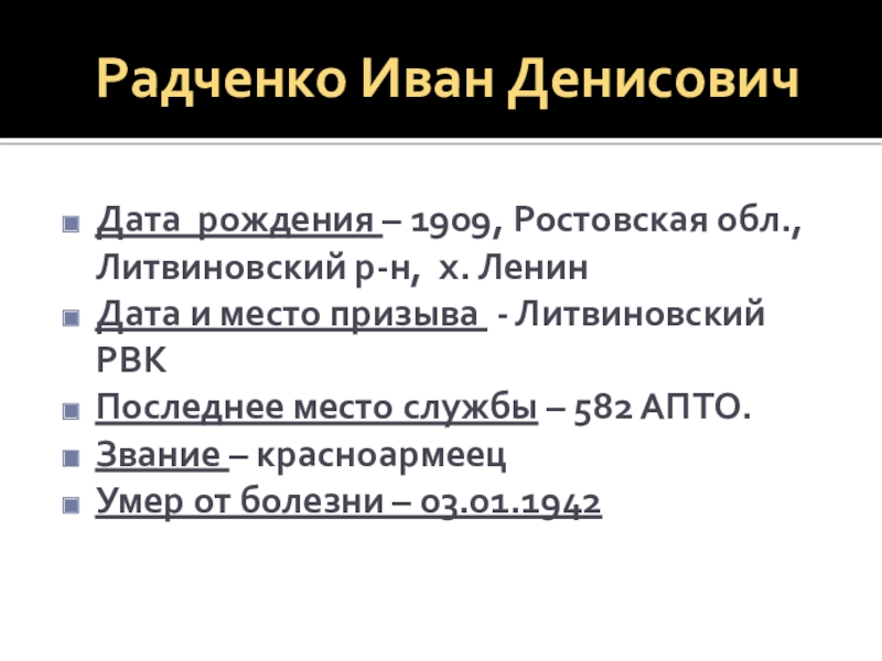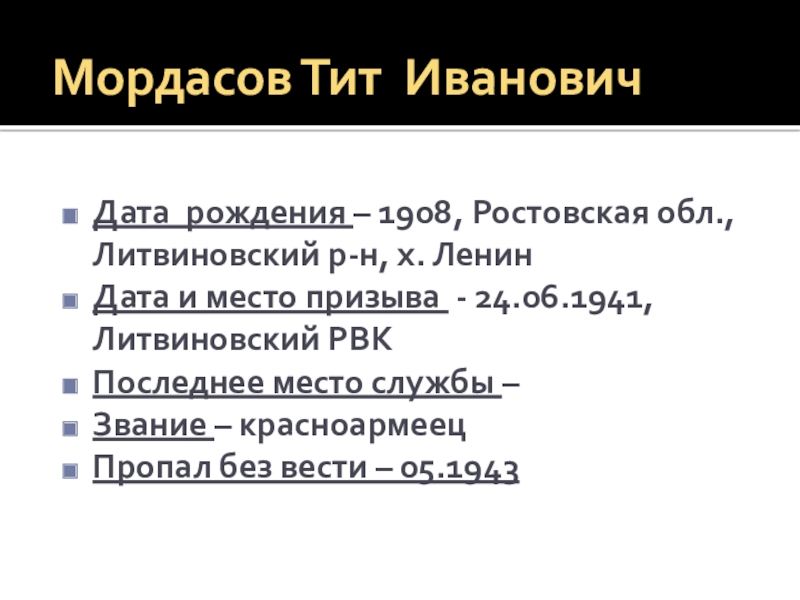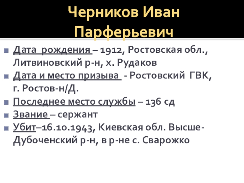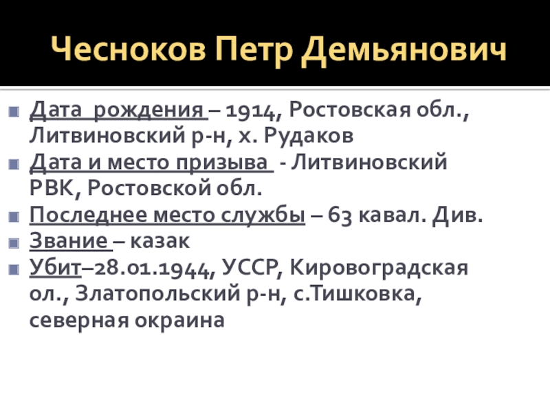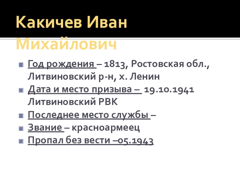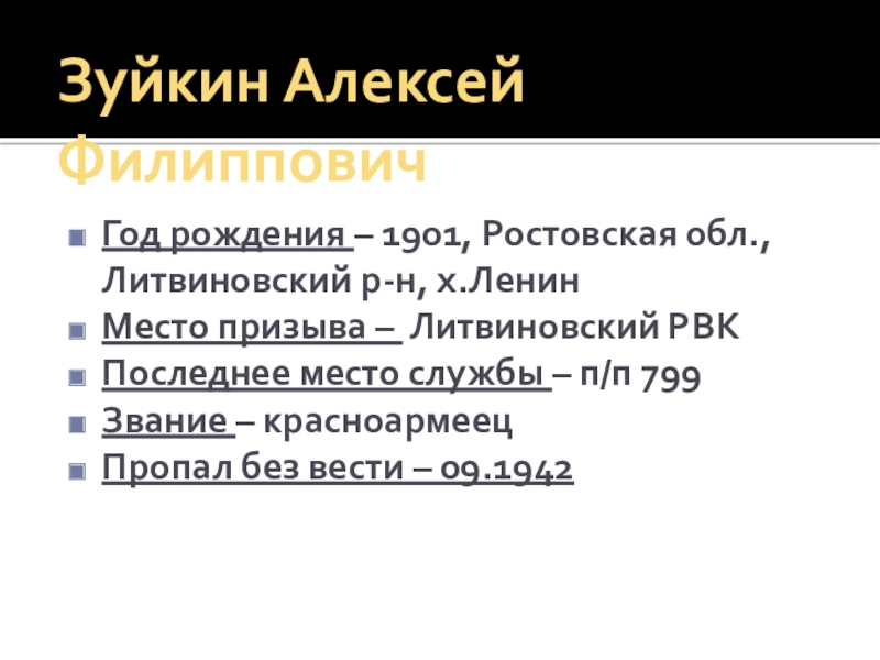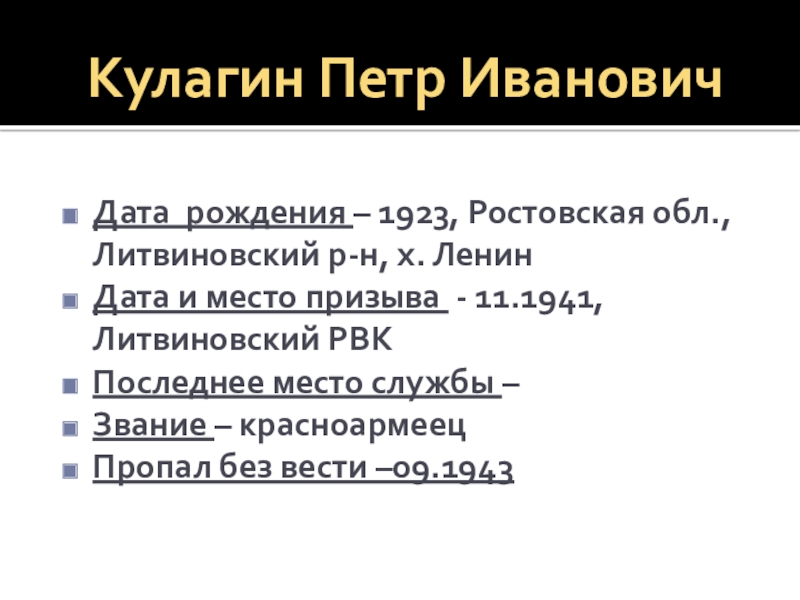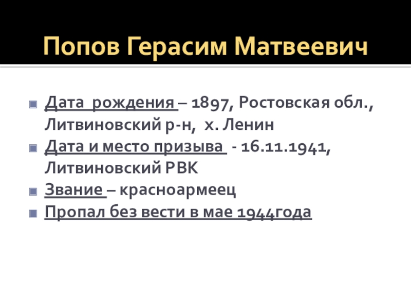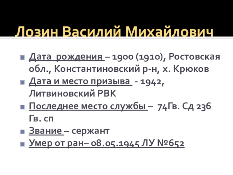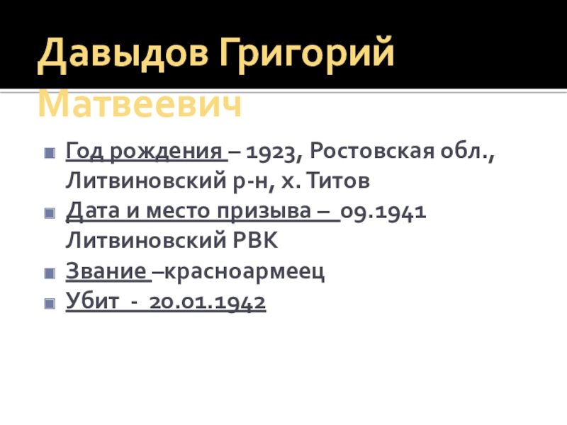 Дата рождения – 1905Ростовская обл., Литвиновский р-н, х. Ленин