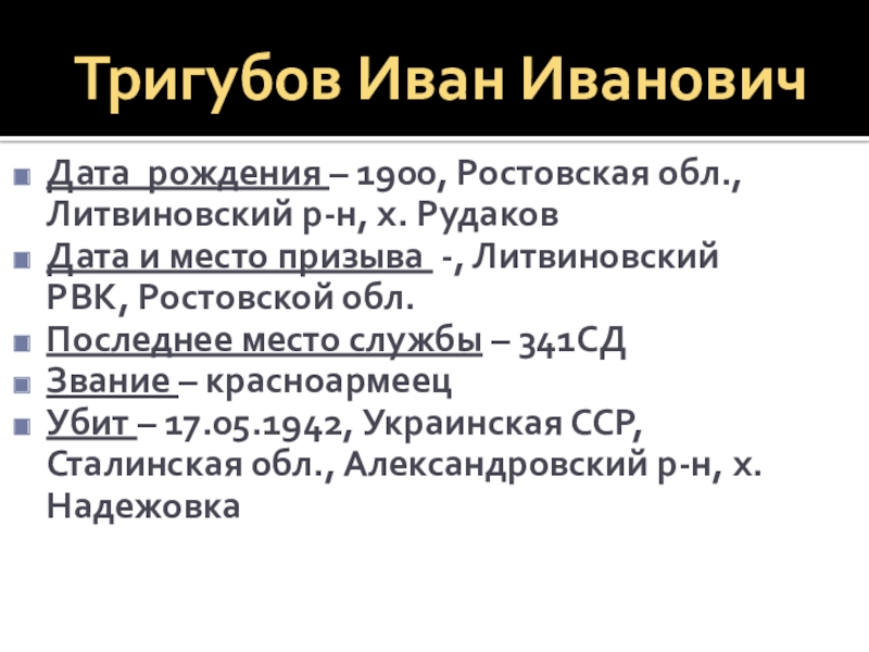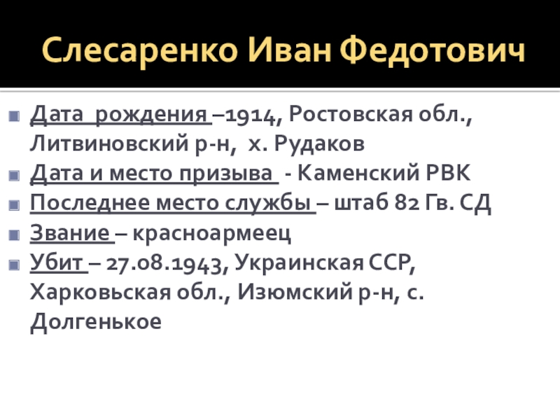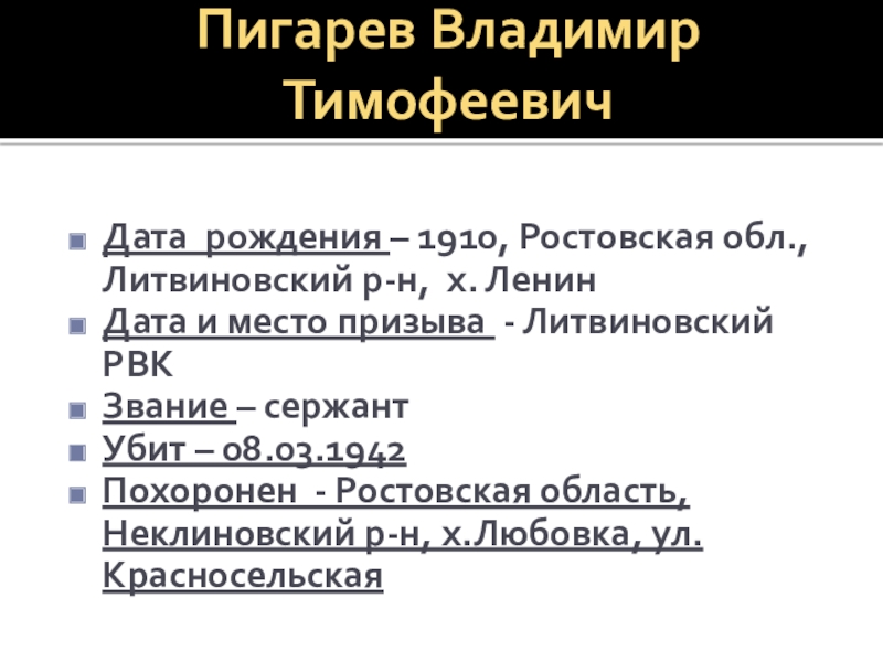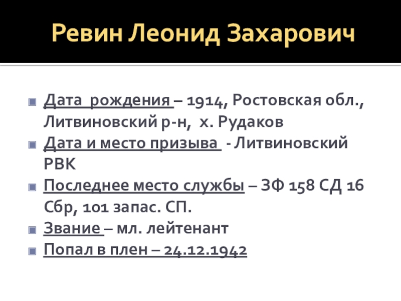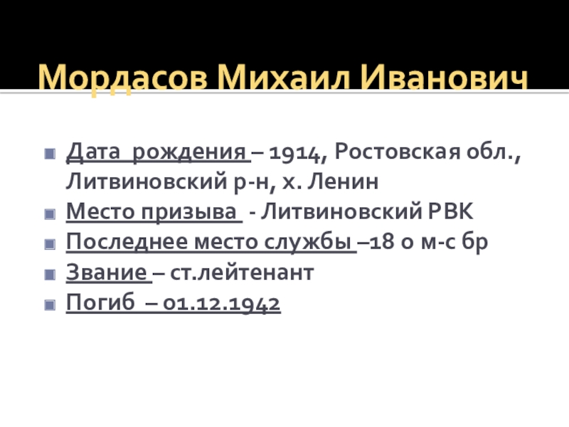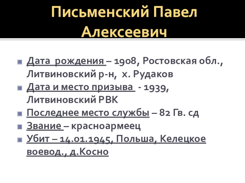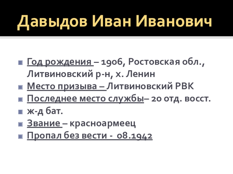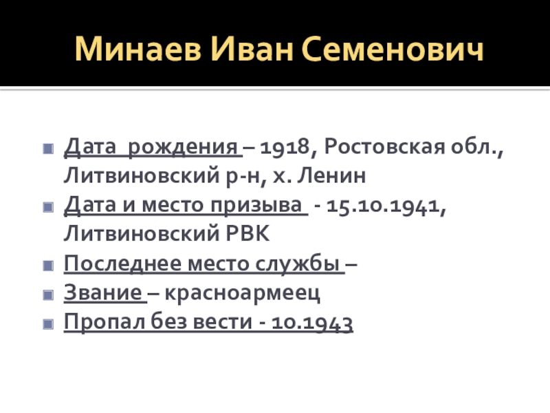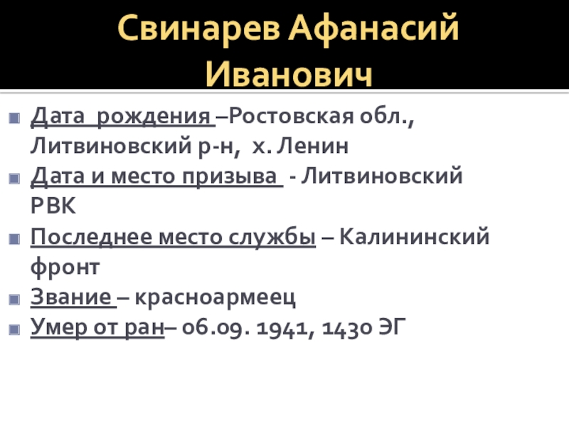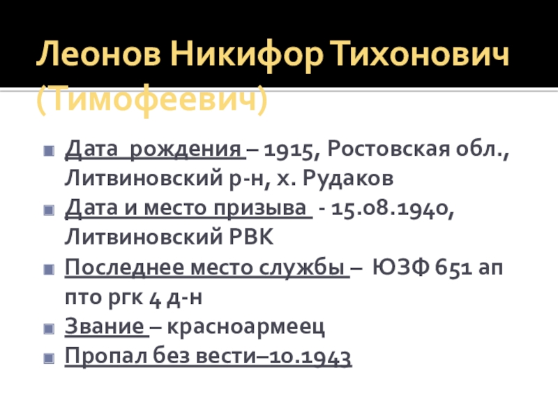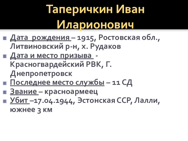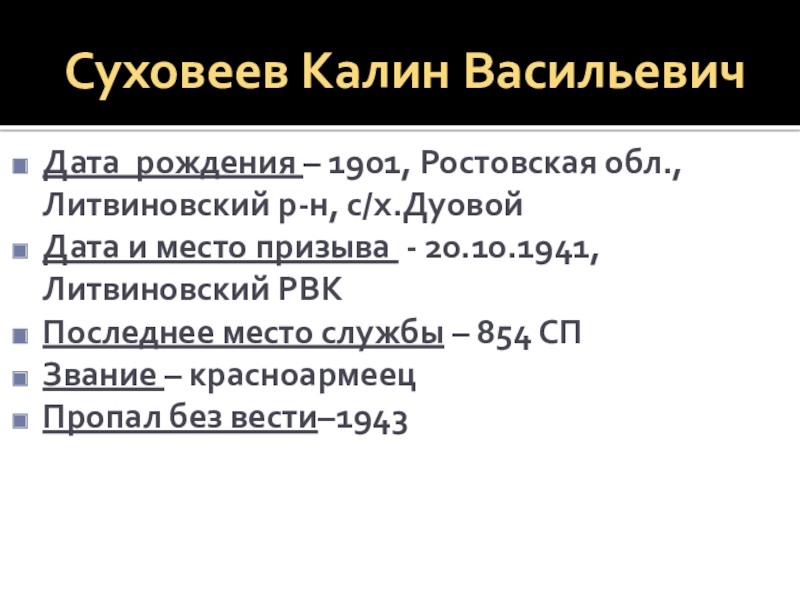 Дата рождения – 1905Ростовская обл., Литвиновский р-н, х. Ленин
