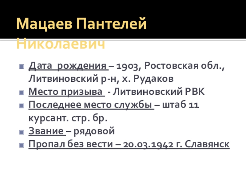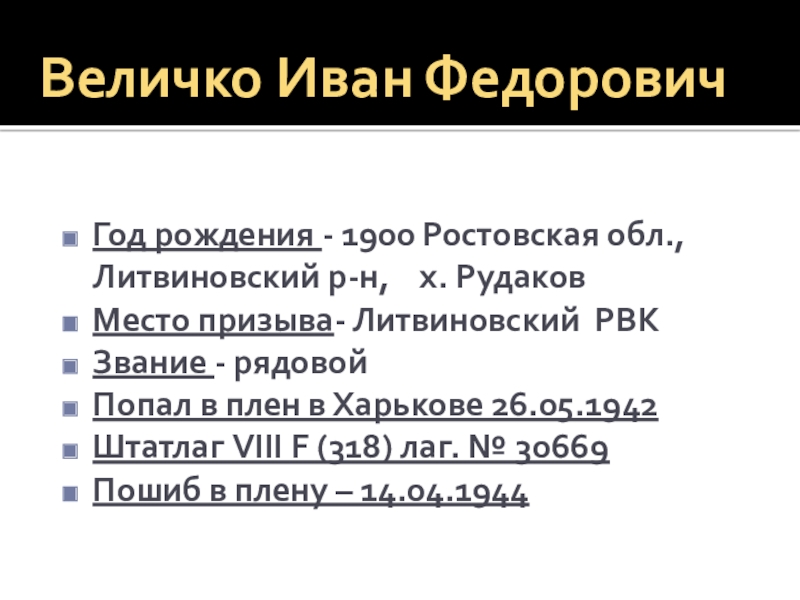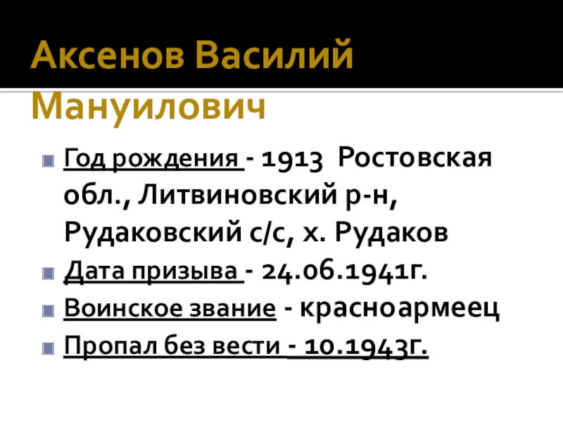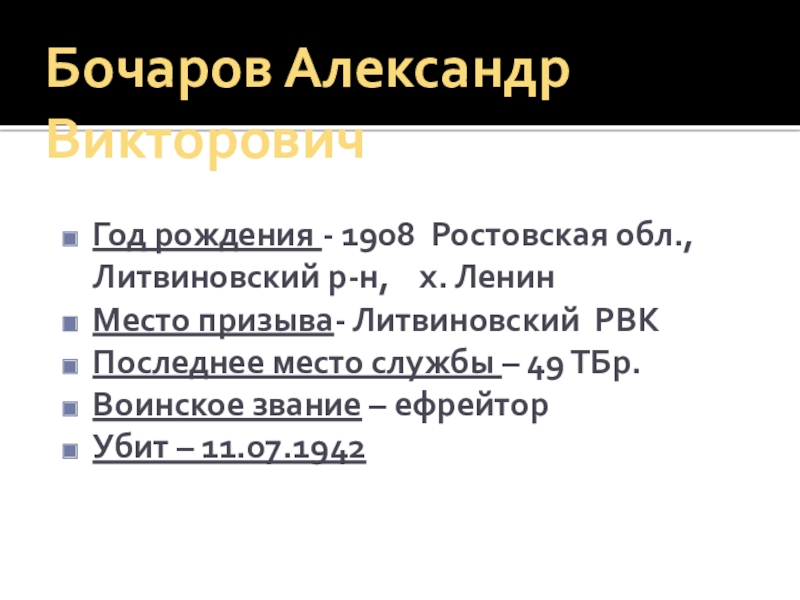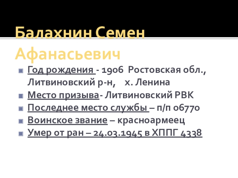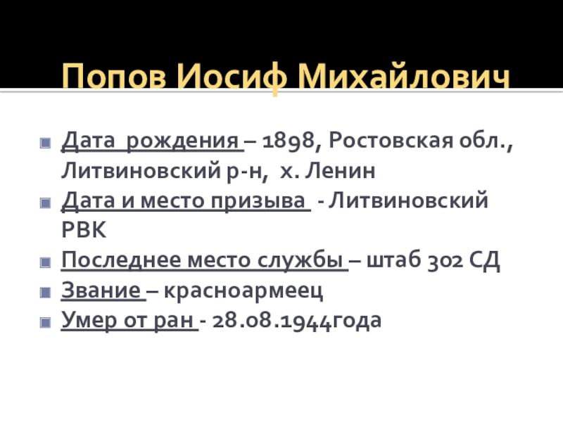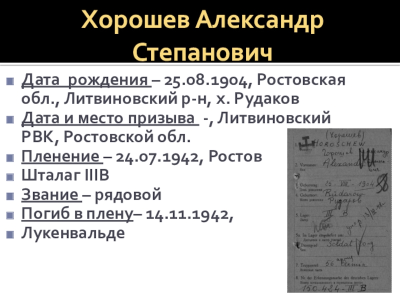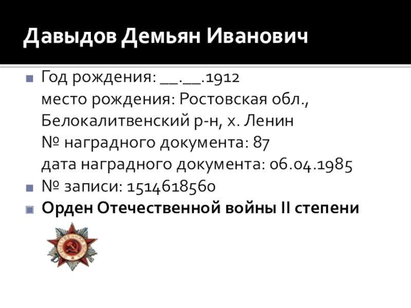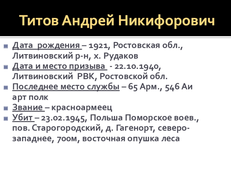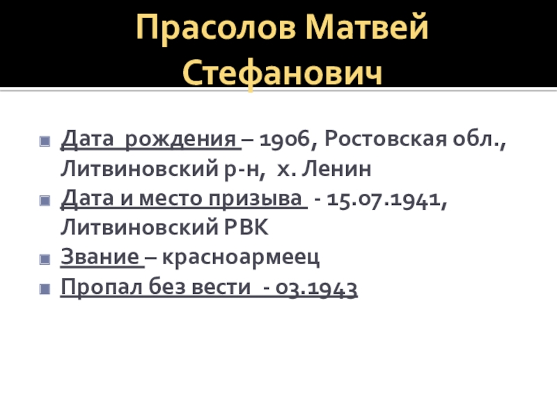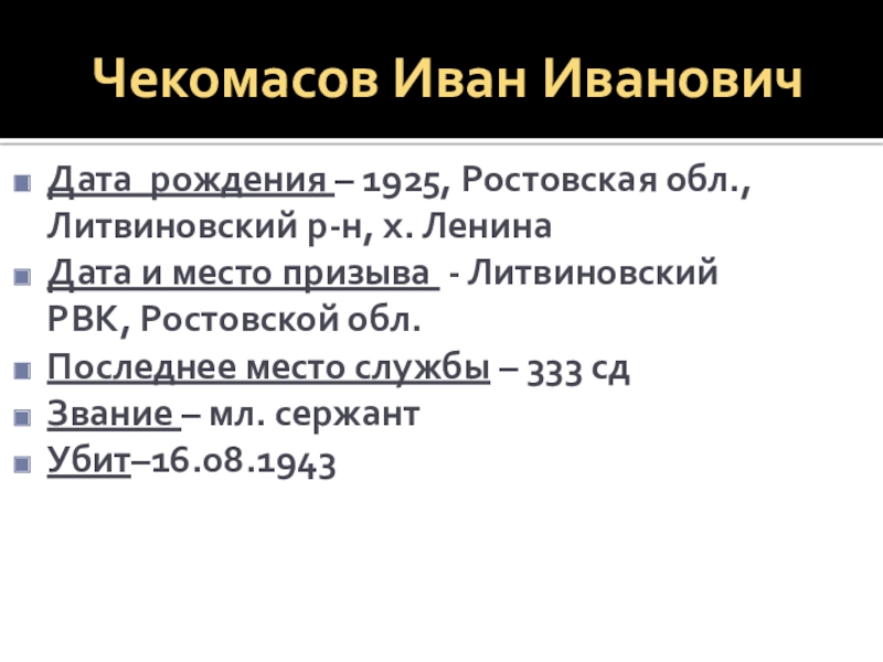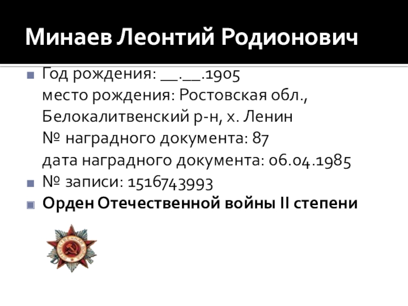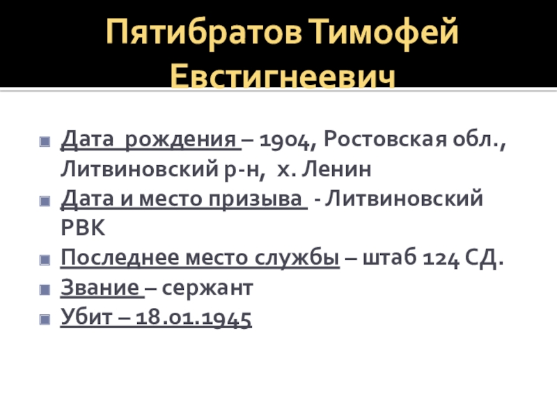 Дата рождения – 1905Ростовская обл., Литвиновский р-н, х. Ленин