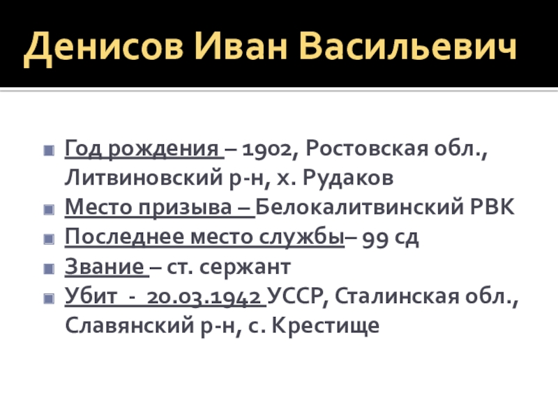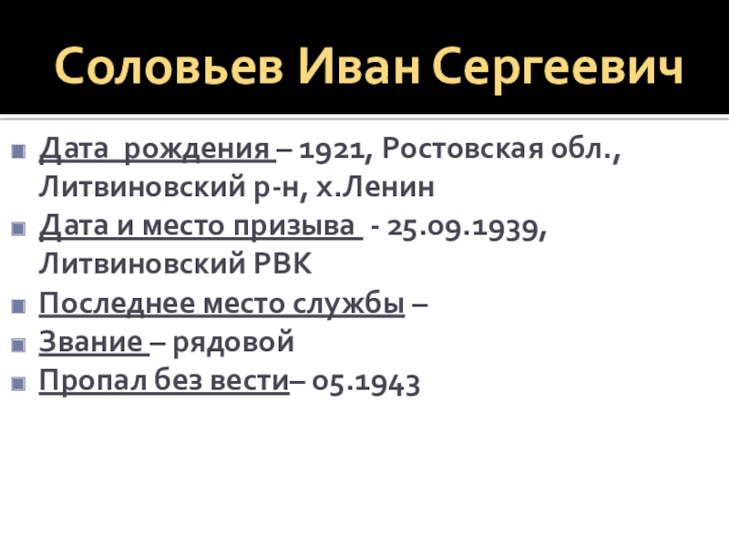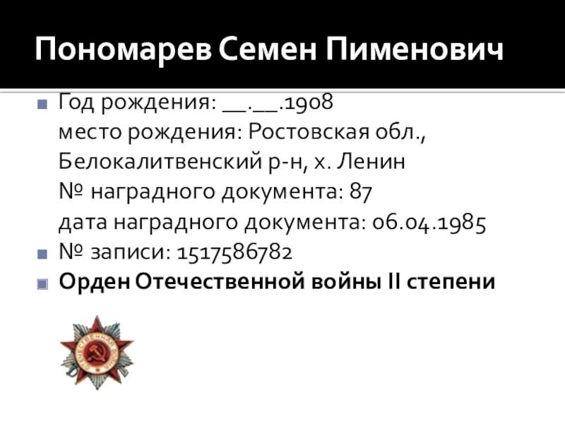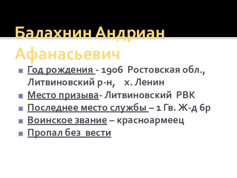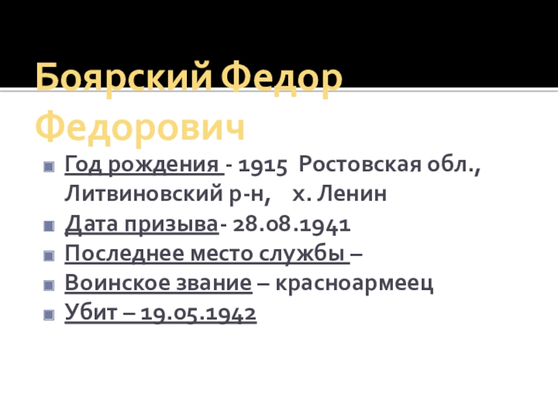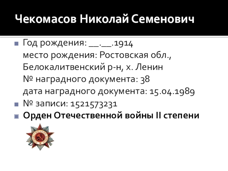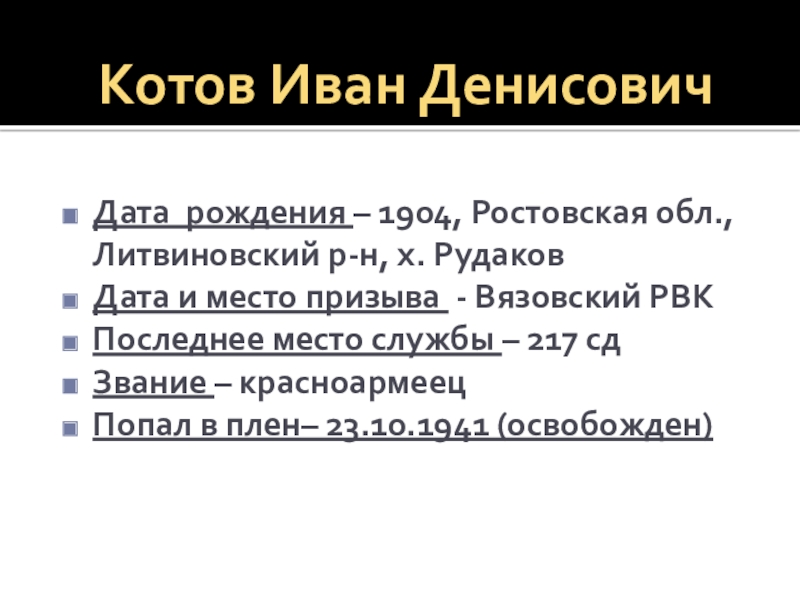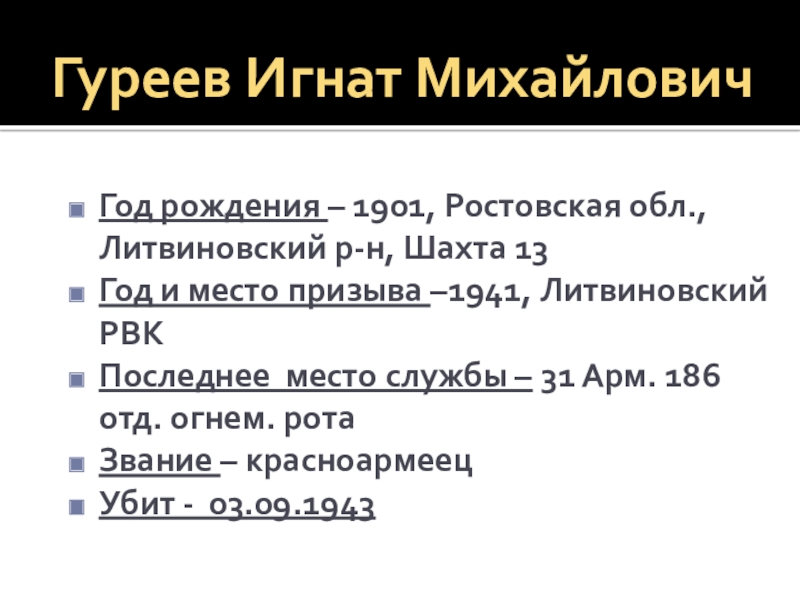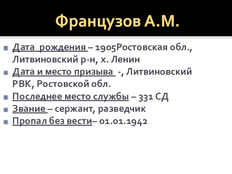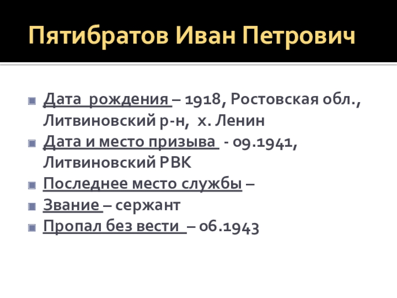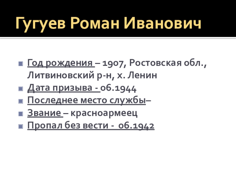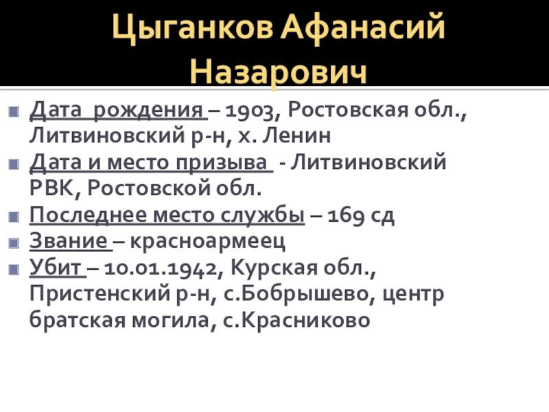Дата рождения – 1905Ростовская обл., Литвиновский р-н, х. Ленин