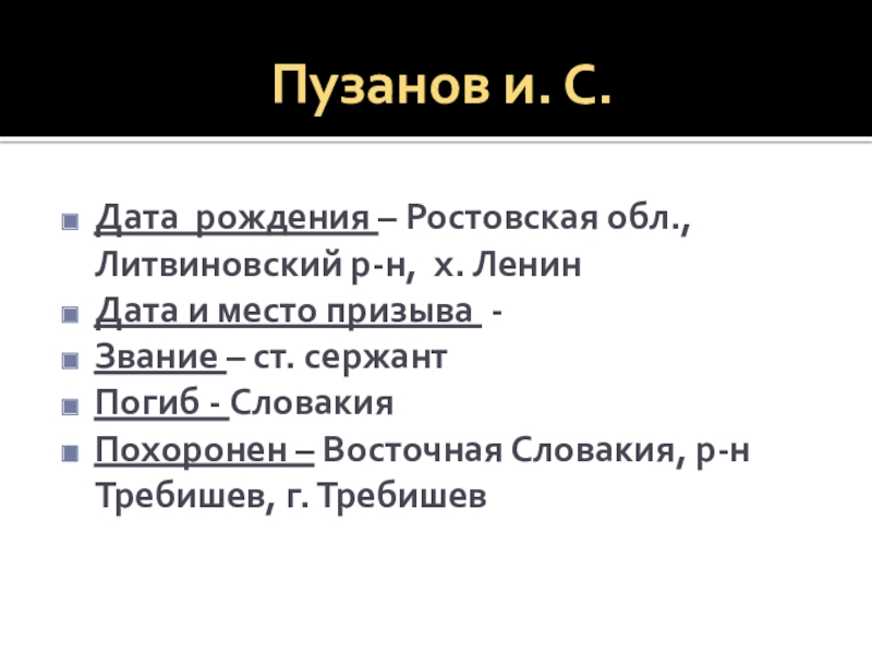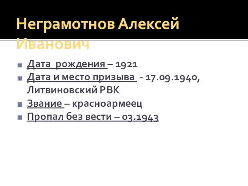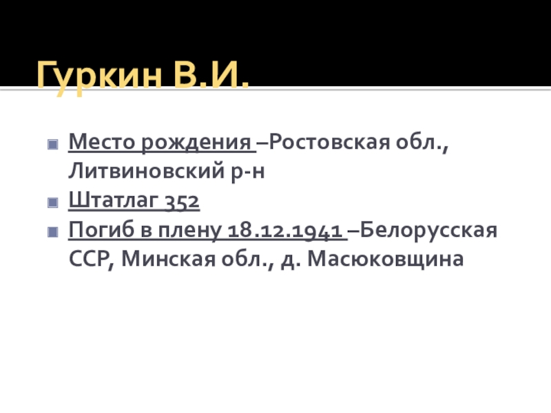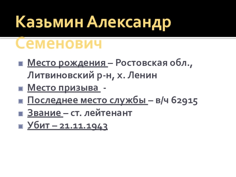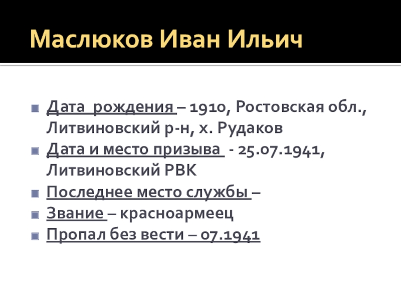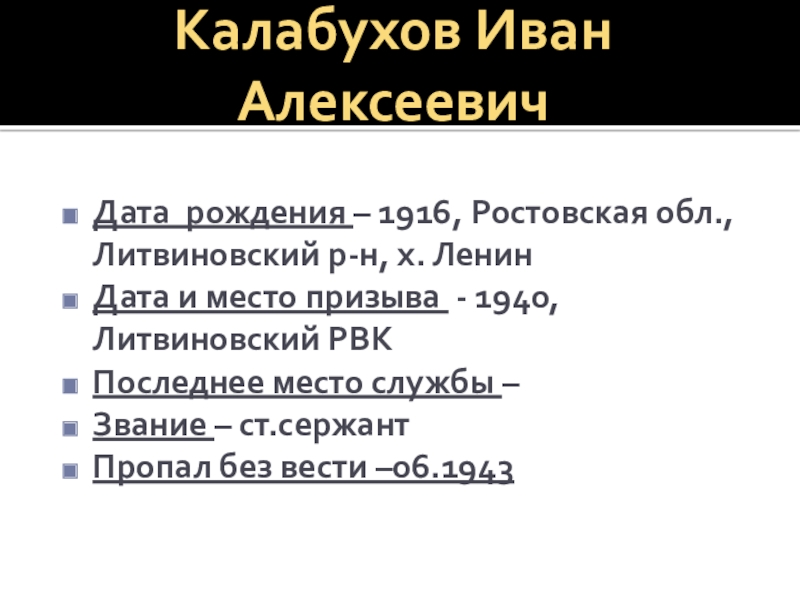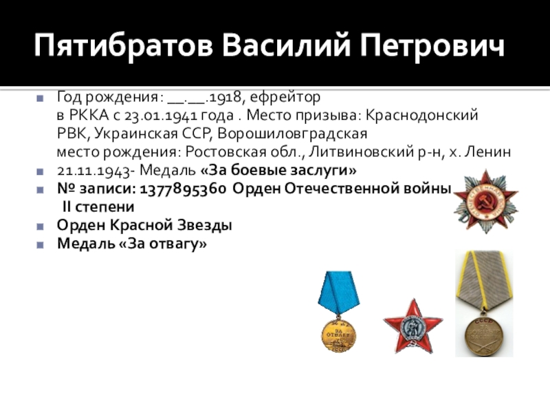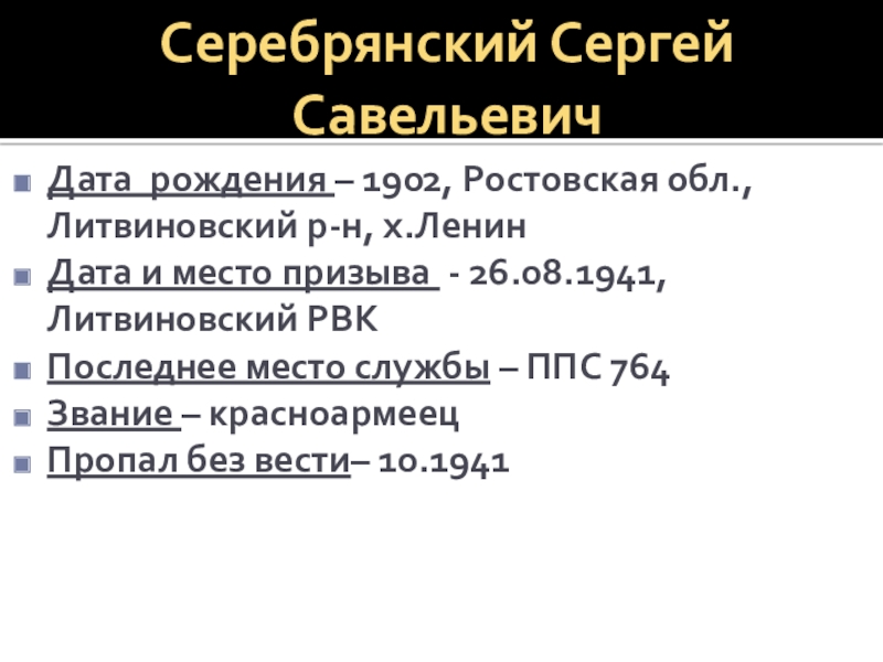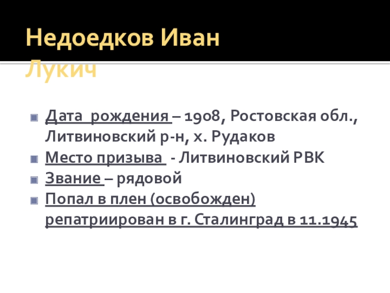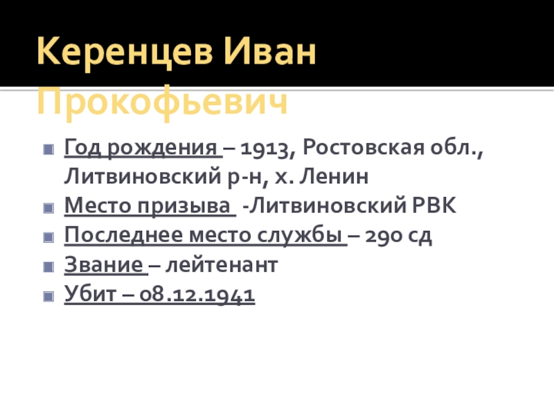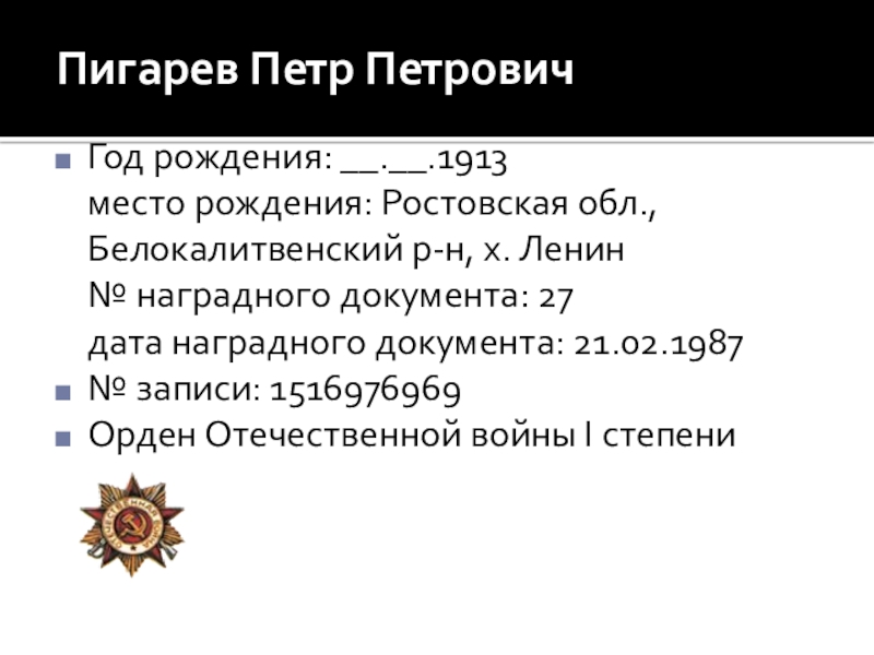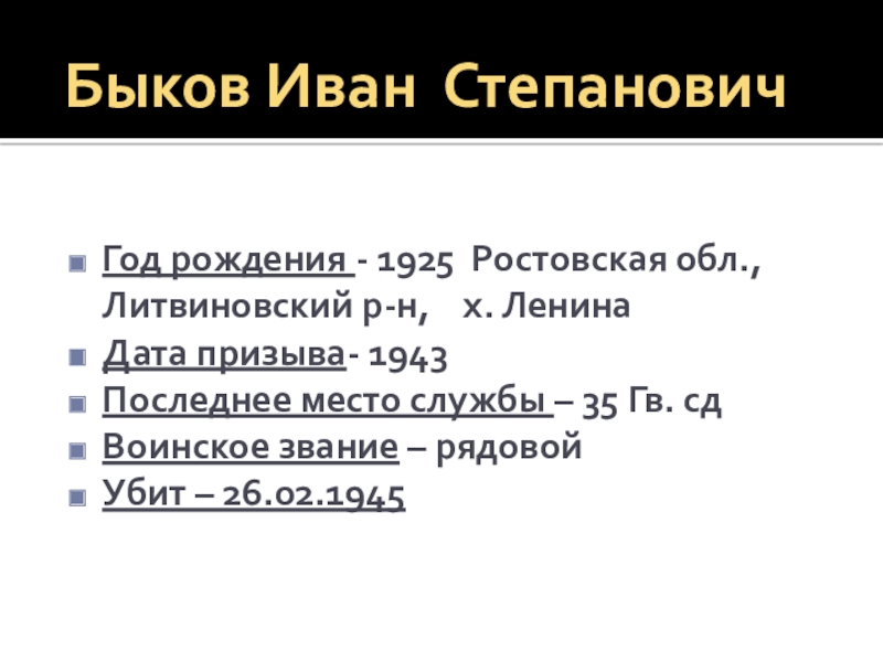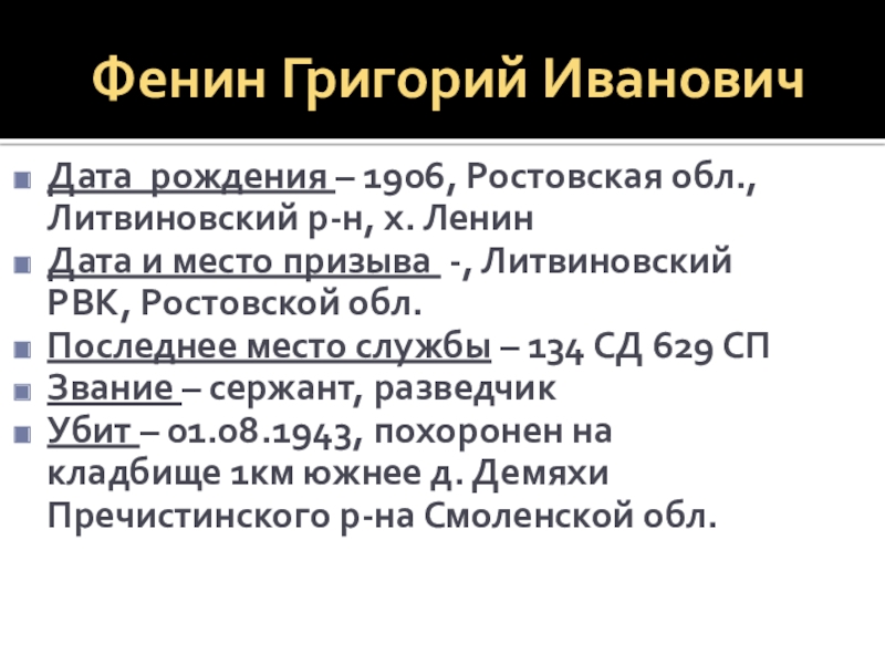 Дата рождения – 1905Ростовская обл., Литвиновский р-н, х. Ленин