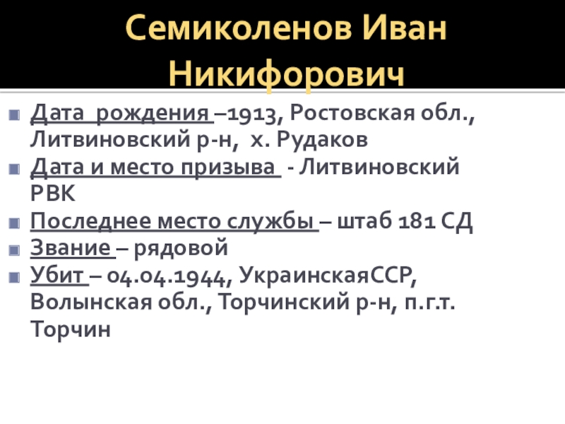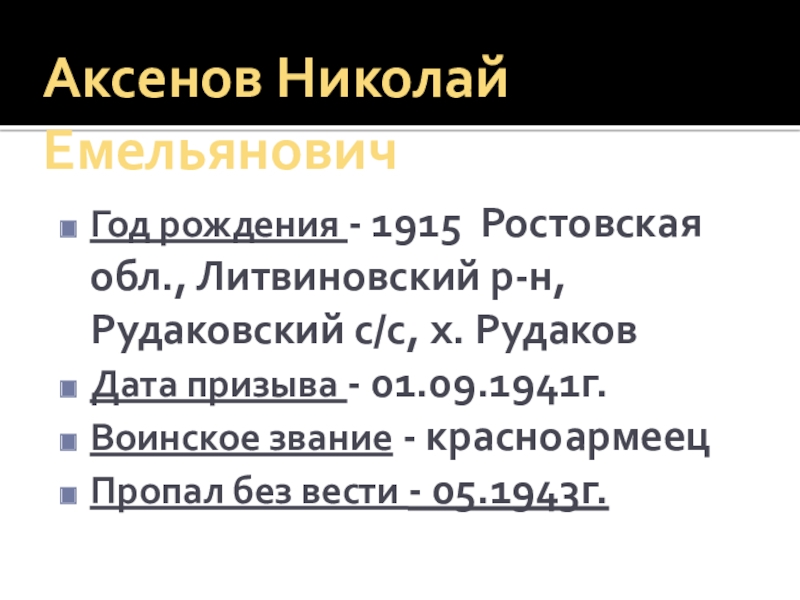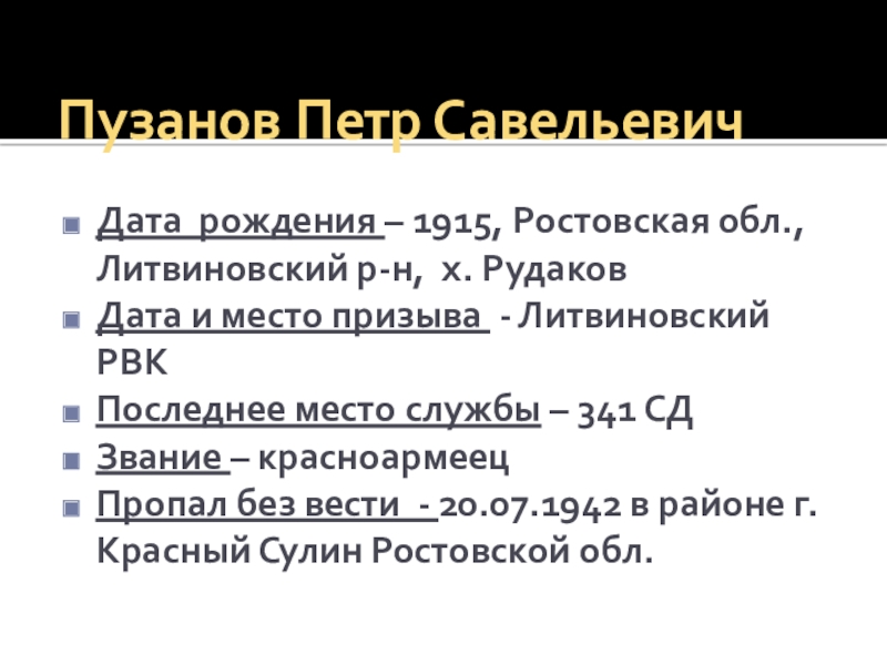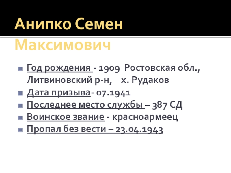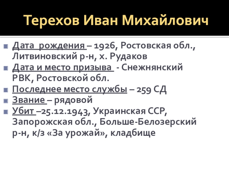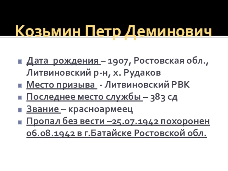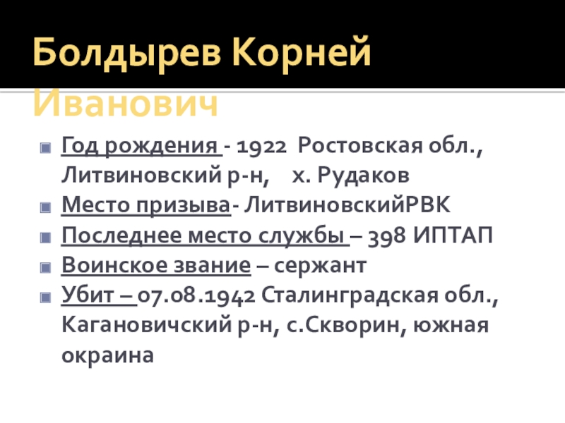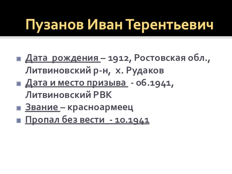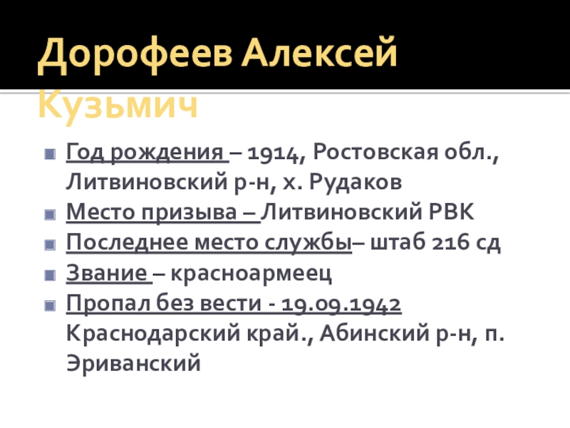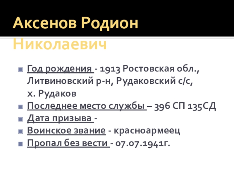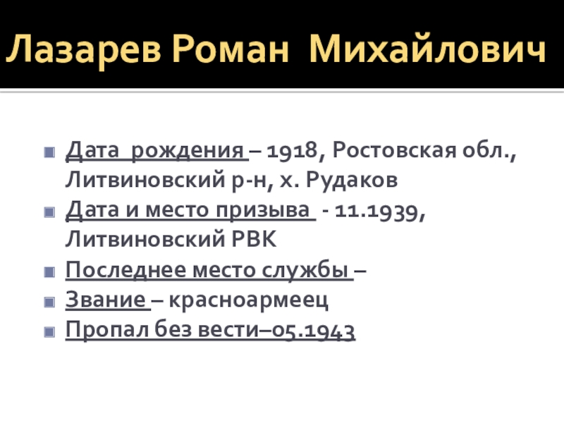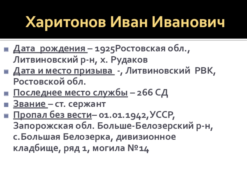 Дата рождения – 1925Ростовская обл., Литвиновский р-н, х. Рудаков