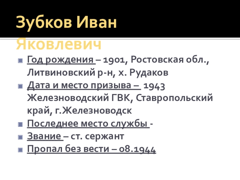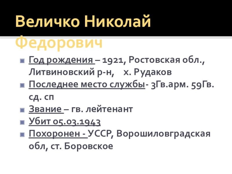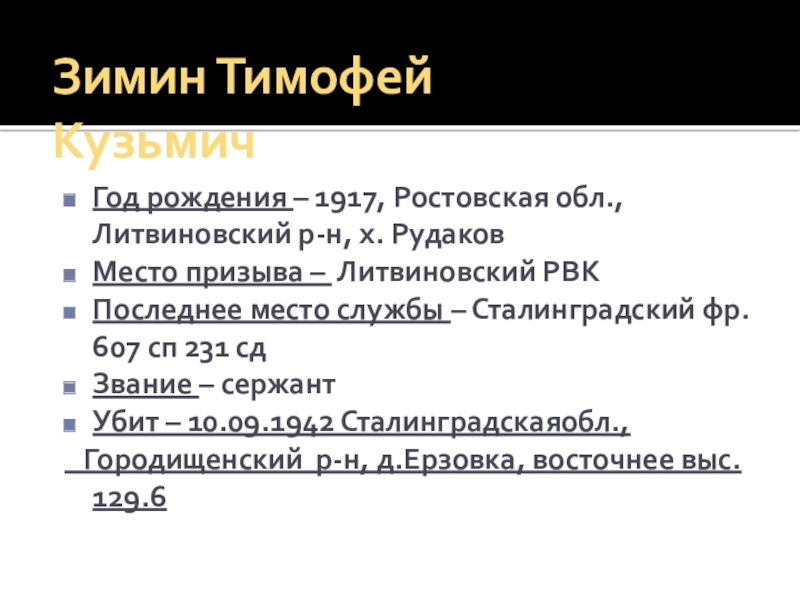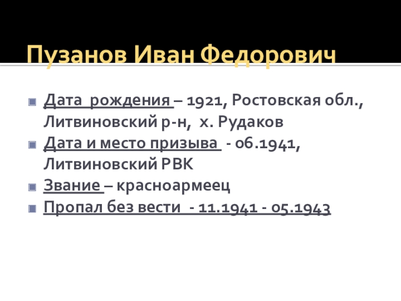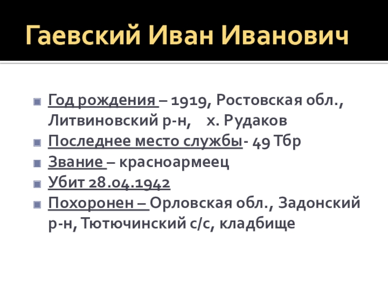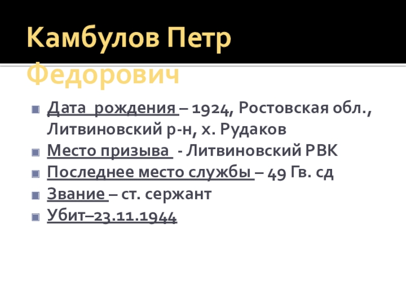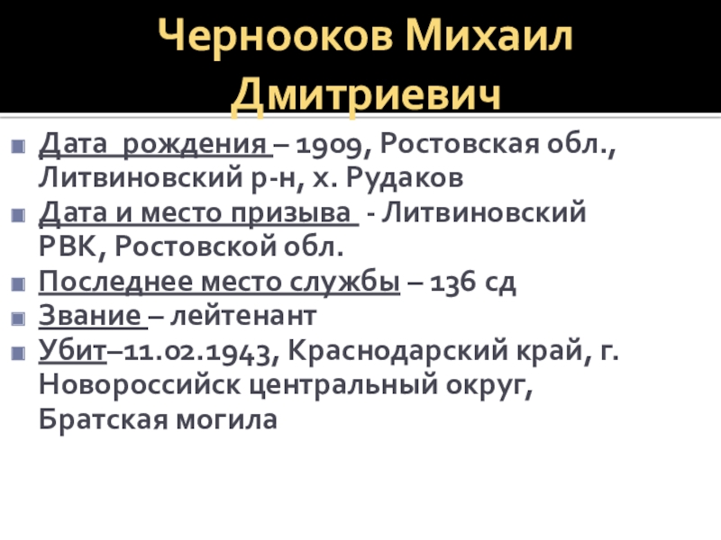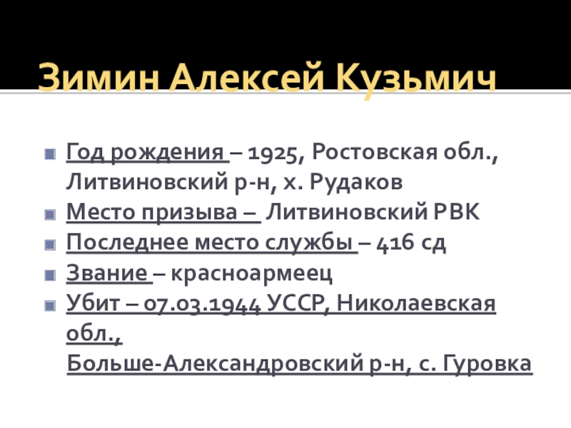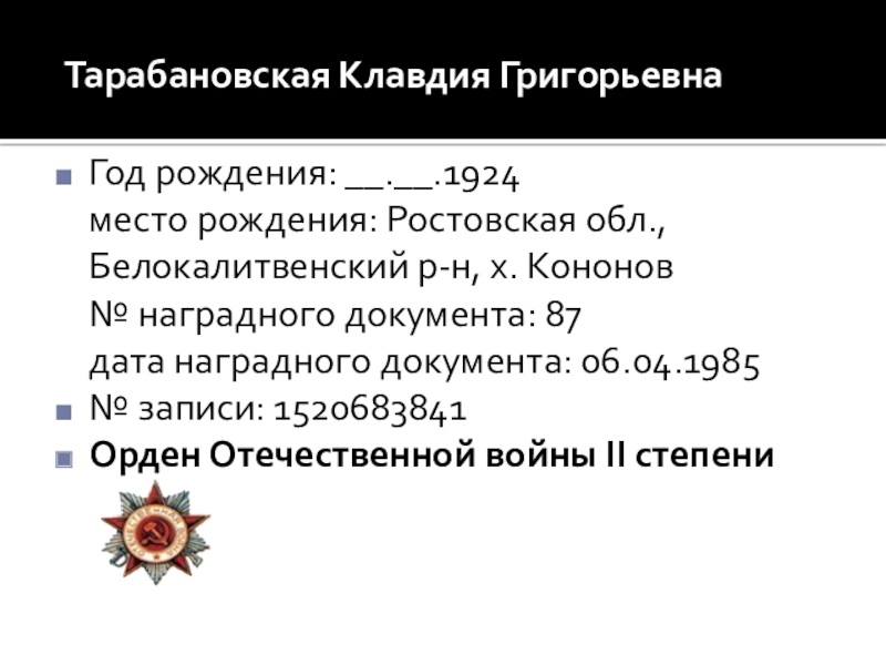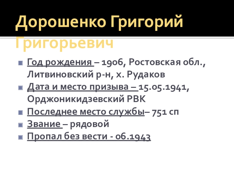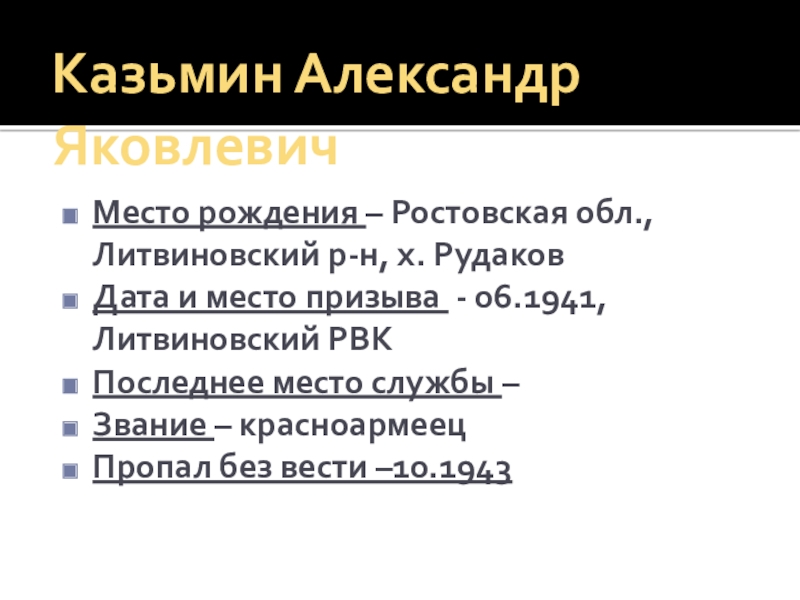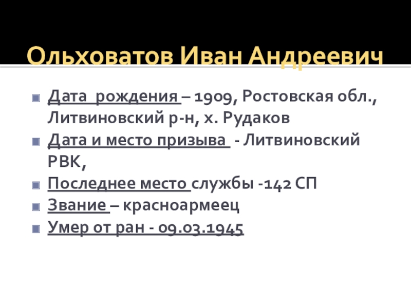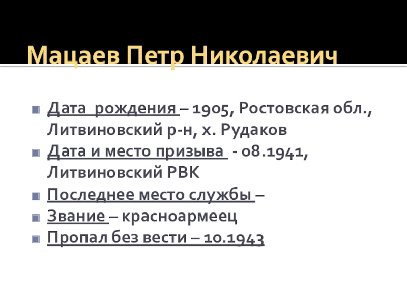 Дата рождения – 1925Ростовская обл., Литвиновский р-н, х. Рудаков
