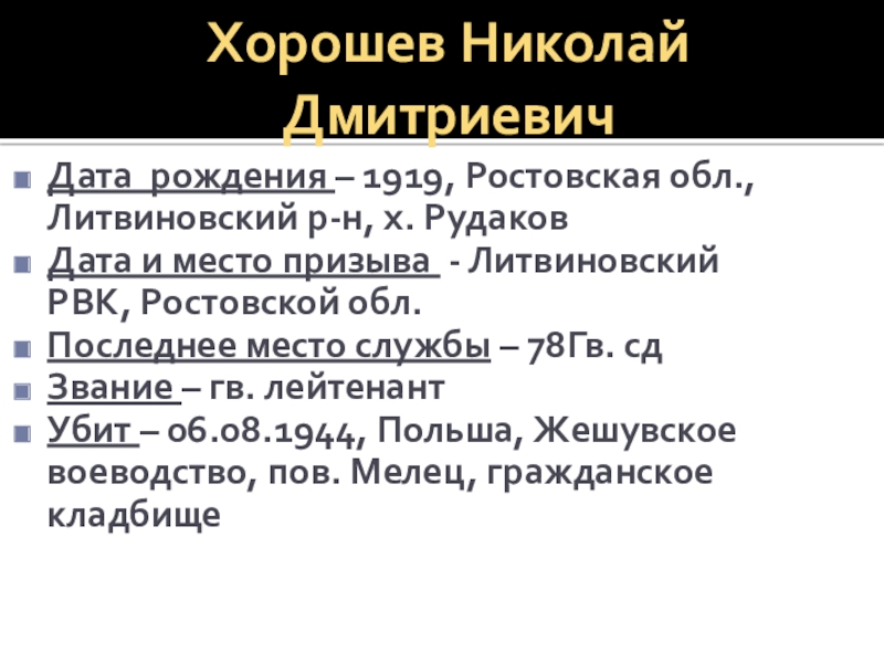 Убит – 06.08.1944, Польша, Жешувское воеводство, пов. Мелец, гражданское кладбище