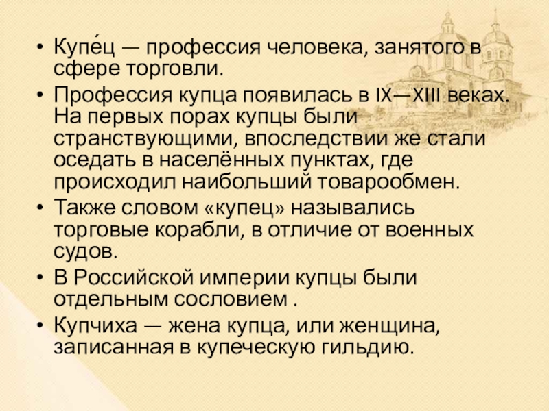 Слайд 2Купе́ц — профессия человека, занятого в сфере торговли.