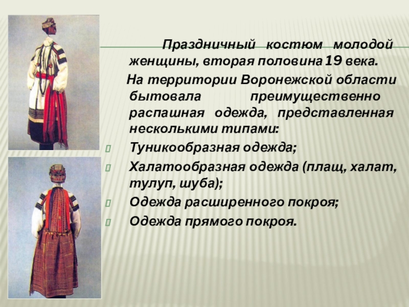 На территории Воронежской области бытовала преимущественно распашная одежда, представленная несколькими типами: