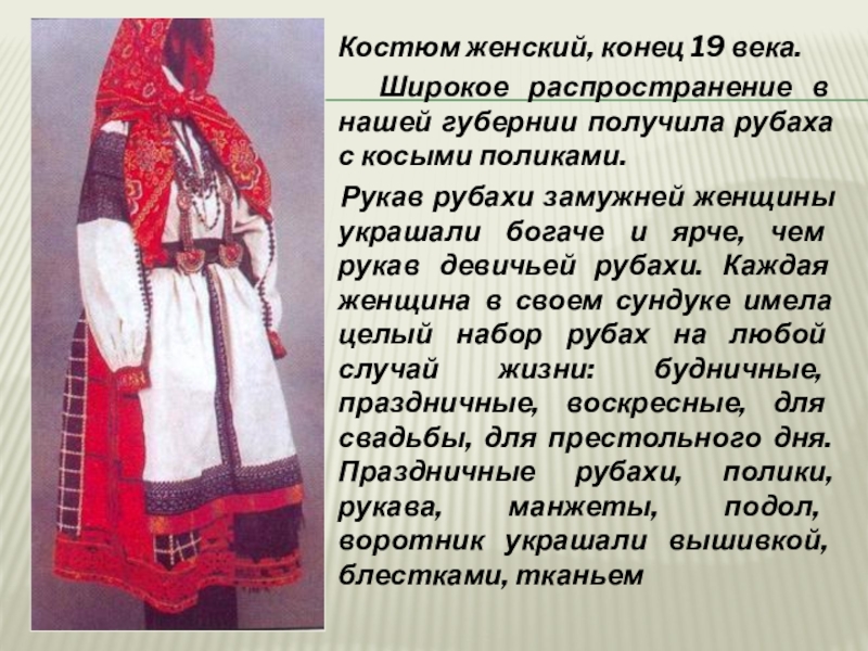 Рукав рубахи замужней женщины украшали богаче и ярче, чем рукав девичьей рубахи. Каждая женщина в своем сундуке имела целый набор рубах на любой случай жизни: будничные, праздничные, воскресные, для свадьбы, для престольного дня. Праздничные рубахи, полики, рукава, манжеты, подол, воротник украшали вышивкой, блестками, тканьем