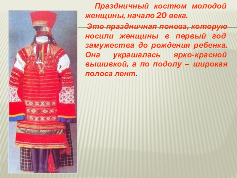 Слайд 15 Праздничный костюм молодой женщины, начало 20 века.