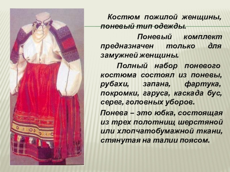 Слайд 13 Костюм пожилой женщины, поневый тип одежды.