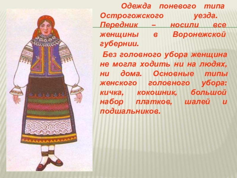 Слайд 16 Одежда поневого типа Острогожского уезда. Передник – носили