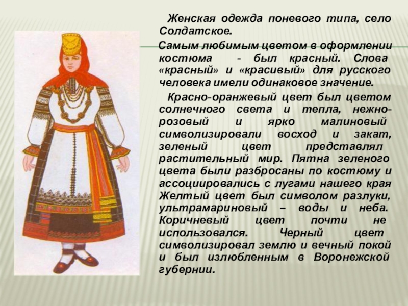 Красно-оранжевый цвет был цветом солнечного света и тепла, нежно-розовый и ярко малиновый символизировали восход и закат, зеленый цвет представлял растительный мир. Пятна зеленого цвета были разбросаны по костюму и ассоциировались с лугами нашего края Желтый цвет был символом разлуки, ультрамариновый – воды и неба. Коричневый цвет почти не использовался. Черный цвет символизировал землю и вечный покой и был излюбленным в Воронежской губернии.