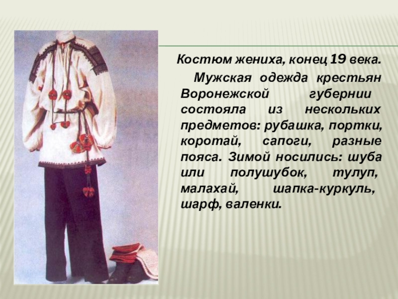 Воронежской губернии состояла из нескольких предметов: рубашка, портки, коротай, сапоги, разные пояса. Зимой носились: шуба или полушубок, тулуп, малахай, шапка-куркуль, шарф, валенки.