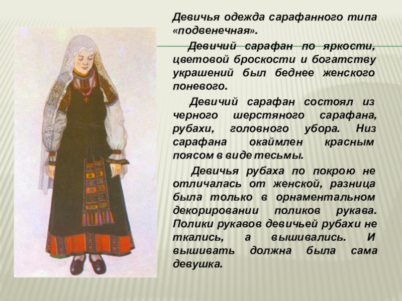 Слайд 18 Девичья одежда сарафанного типа «подвенечная».