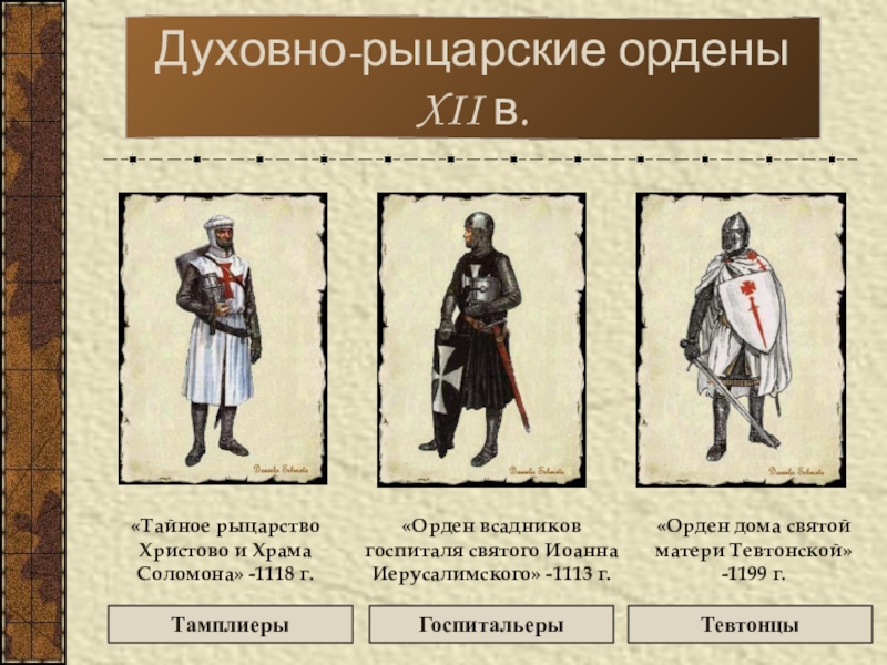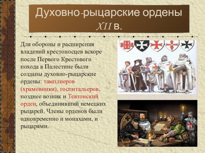 в Палестине были созданы духовно-рыцарские ордены: тамплиеров (храмовники), госпитальеров, позднее возник и Тевтонский орден, объединивший немецких рыцарей. Члены орденов были одновременно и монахами, и рыцарями.