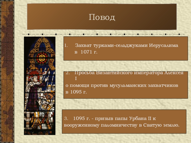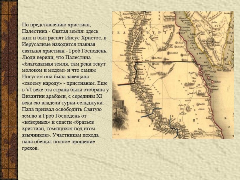 Целью первых крестовых походов было освобождение Палестины, в первую очередь Иерусалима (с Гробом Господним), от турок-сельджуков