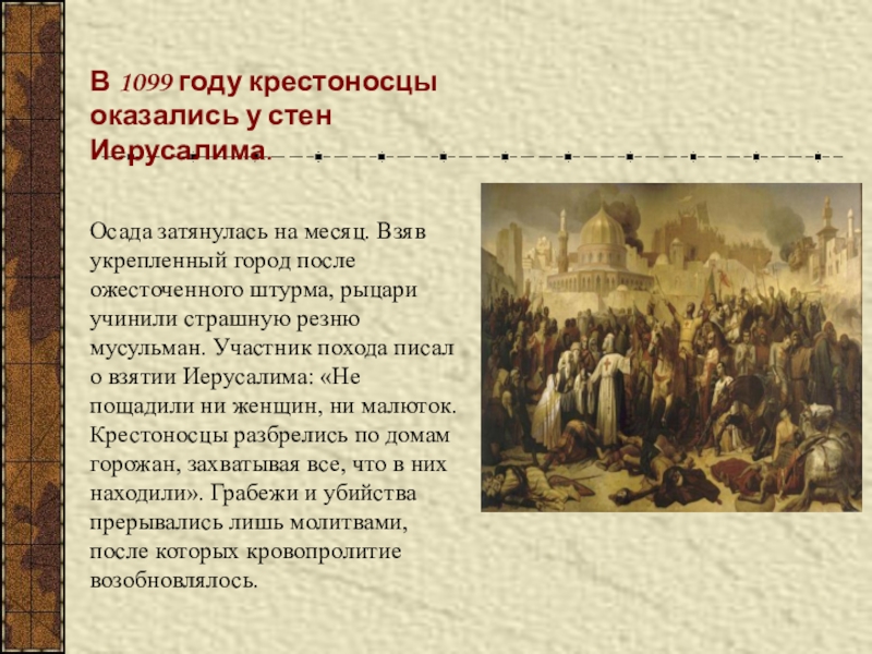 месяц. Взяв укрепленный город после ожесточенного штурма, рыцари учинили страшную резню мусульман. Участник похода писал о взятии Иерусалима: «Не пощадили ни женщин, ни малюток. Крестоносцы разбрелись по домам горожан, захватывая все, что в них находили». Грабежи и убийства прерывались лишь молитвами, после которых кровопролитие возобновлялось.