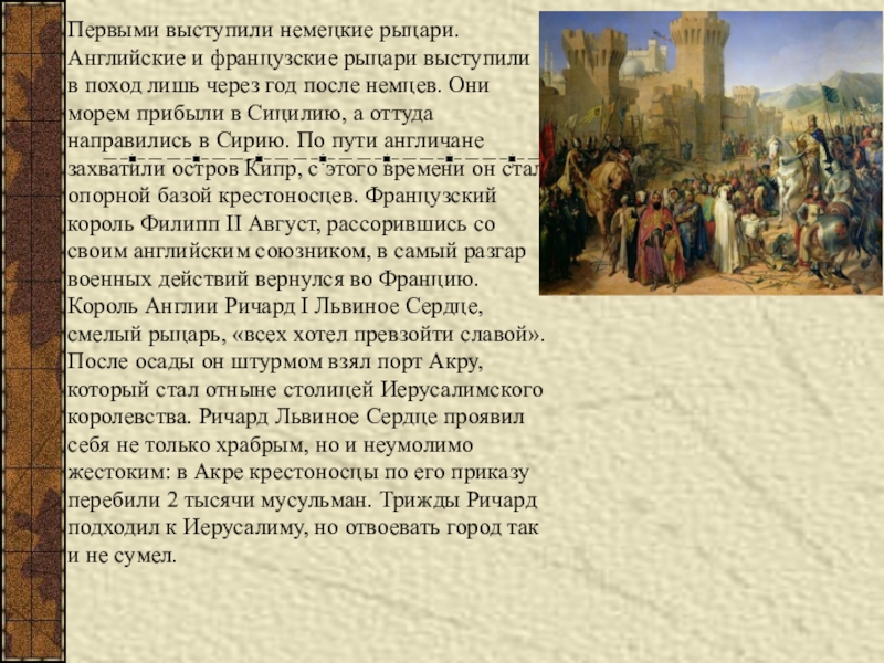 лишь через год после немцев. Они морем прибыли в Сицилию, а оттуда направились в Сирию. По пути англичане захватили остров Кипр, с этого времени он стал опорной базой крестоносцев. Французский король Филипп II Август, рассорившись со своим английским союзником, в самый разгар военных действий вернулся во Францию. Король Англии Ричард I Львиное Сердце, смелый рыцарь, «всех хотел превзойти славой». После осады он штурмом взял порт Акру, который стал отныне столицей Иерусалимского королевства. Ричард Львиное Сердце проявил себя не только храбрым, но и неумолимо жестоким: в Акре крестоносцы по его приказу перебили 2 тысячи мусульман. Трижды Ричард подходил к Иерусалиму, но отвоевать город так и не сумел.