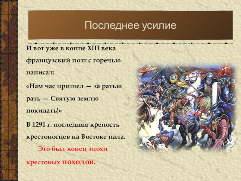 В 1291 г. последняя крепость крестоносцев на Востоке пала. Это был конец эпохи крестовых походов.