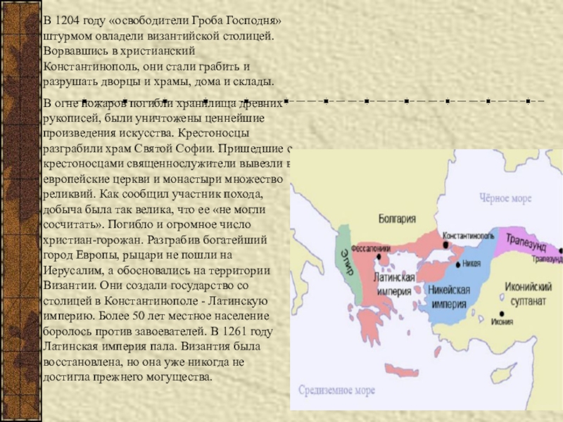 В огне пожаров погибли хранилища древних рукописей, были уничтожены ценнейшие произведения искусства. Крестоносцы разграбили храм Святой Софии. Пришедшие с крестоносцами священнослужители вывезли в европейские церкви и монастыри множество реликвий. Как сообщил участник похода, добыча была так велика, что ее «не могли сосчитать». Погибло и огромное число христиан-горожан. Разграбив богатейший город Европы, рыцари не пошли на Иерусалим, а обосновались на территории Византии. Они создали государство со столицей в Константинополе - Латинскую империю. Более 50 лет местное население боролось против завоевателей. В 1261 году Латинская империя пала. Византия была восстановлена, но она уже никогда не достигла прежнего могущества.